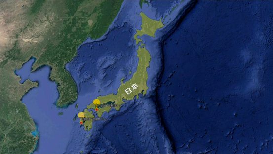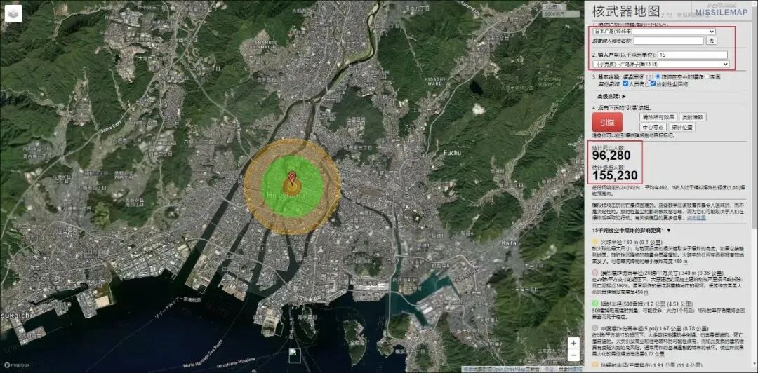 在地图中随意拖动坐标点来定位核爆测试的中心位置,在选择框中也提供了一些城市,这里我们选择定位到广岛市。