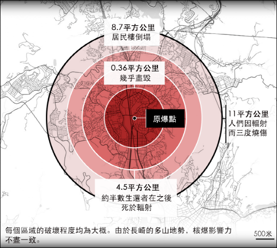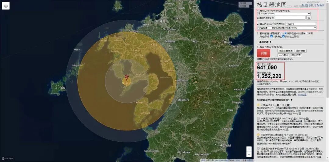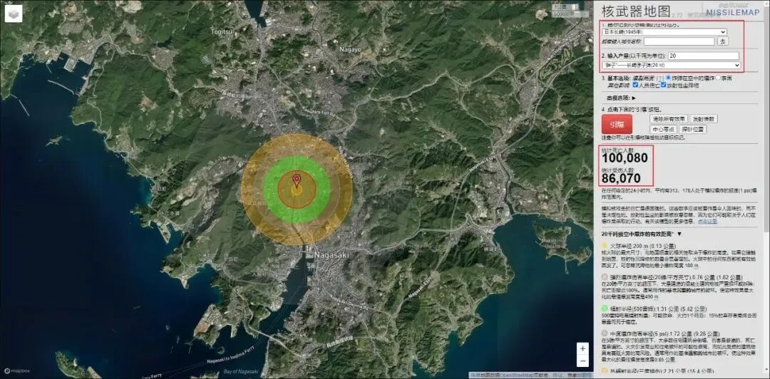 再把测试位置切换到“长崎市”,选择“胖子”原子弹,点击“起爆”,得到以下结果。