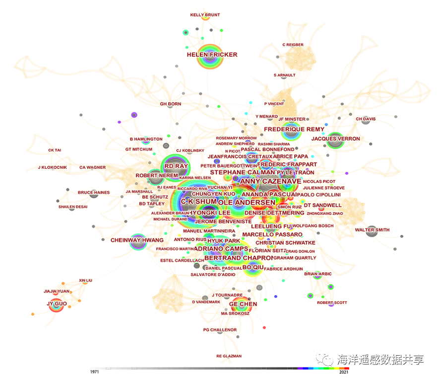 在全球卫星测高作者集群中,有很多来自我国或华人学者,他们和国内外科学家存在密切的合作,为我国卫星测高的各方面发展做出了突出贡献。