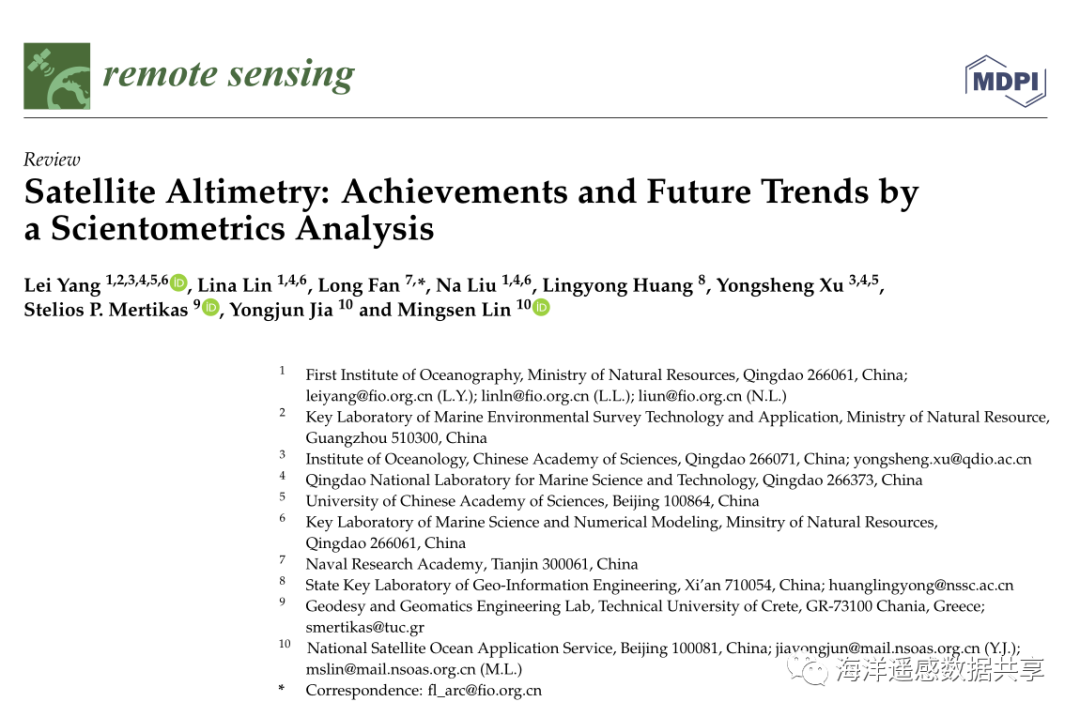50周年之际,国际知名遥感杂志《Remote Sensing》在线发表了中国、希腊等海洋遥感学者撰写的综述论文“Satellite Altimetry: Achievements and Future Trends by a Scientometrics Analysis”。