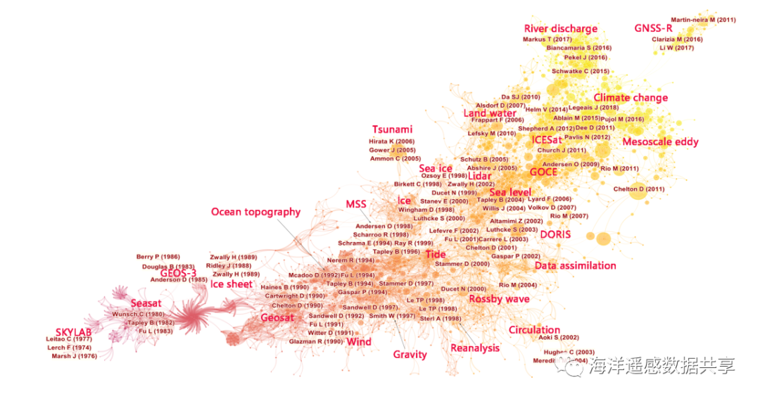 在揭示研究热点的同时,通过分析还发现一些卫星测高的应用领域出现显著的衰退,最明显的属于地球物理(大地测量)领域,该领域主要是应用测高数据分析重力场、海底地形和构造等,表明这个领域的研究可能已经趋于成熟,较难发现新的科学问题,或者当前问题无法通过现有的数据和技术解决。因此面对这种衰退的趋势,解决办法只有革新技术方法,发展新型测高卫星,提高海面高观测精度,以及寻求和AI等新技术的合作。