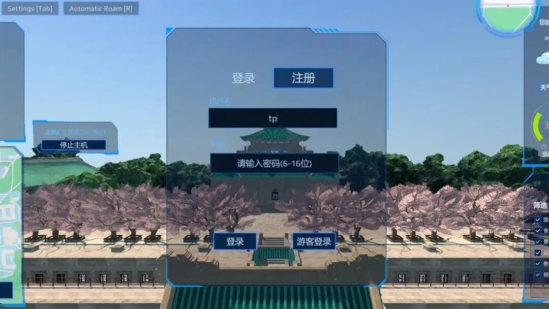 在校园三维模型基础上,4位同学开发了一系列如虚拟报告厅、珞珈漫游、校园跑酷、拍照打卡等交互功能,并加入了人脸识别、语音识别等AI工具。团队还将数字模型与实体映射,搭建了智慧校园游览一体化解决平台,可实时显示校园天气,探索周边去处,实现了虚实间的融合与交互。