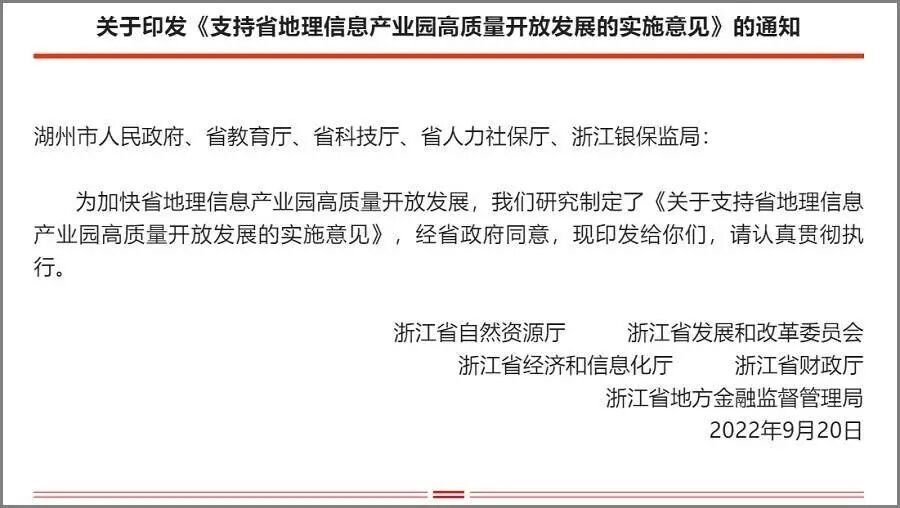 2022年9月20日,浙江省自然资源厅、浙江省发展和改革委员会、浙江省经济和信息化厅、浙江省财政厅、浙江省地方金融监督管理局为加快省地理信息产业园高质量开放发展,研究制定了《关于支持省地理信息产业园高质量开放发展的实施意见》并正式向相关部门发布。该《意见》的第一部分就是关于“加快产业园国际化进程”,将地理信息产业的国际化列为“一号工程”。