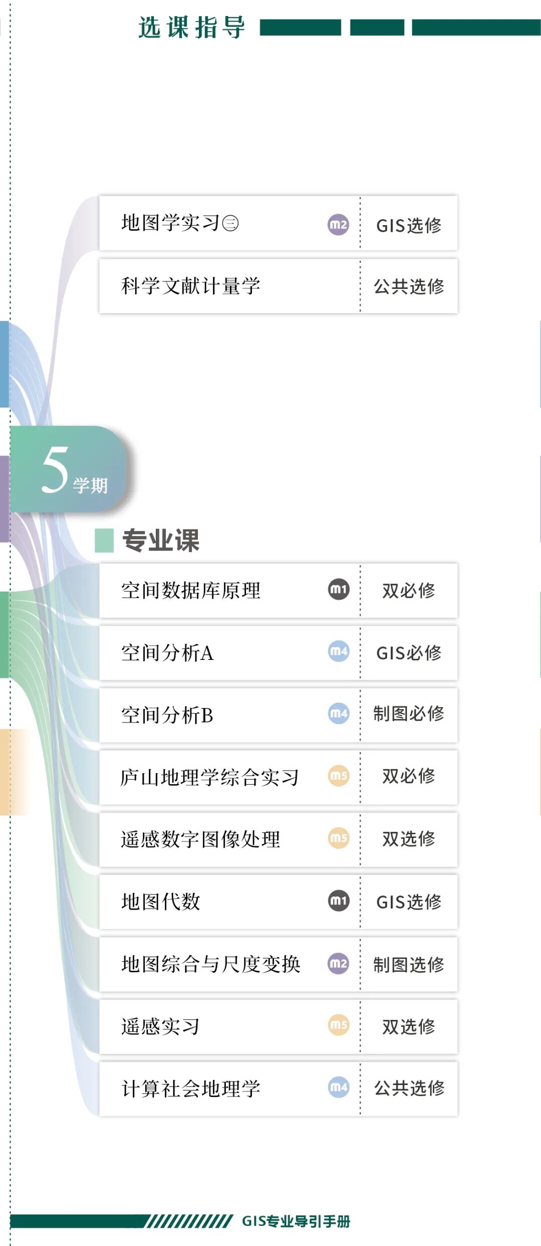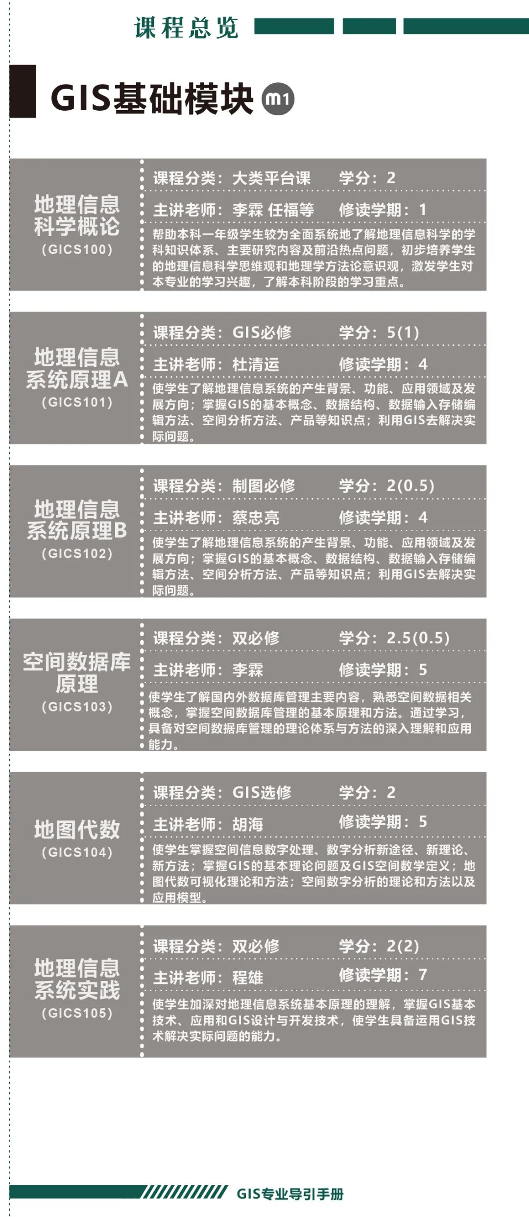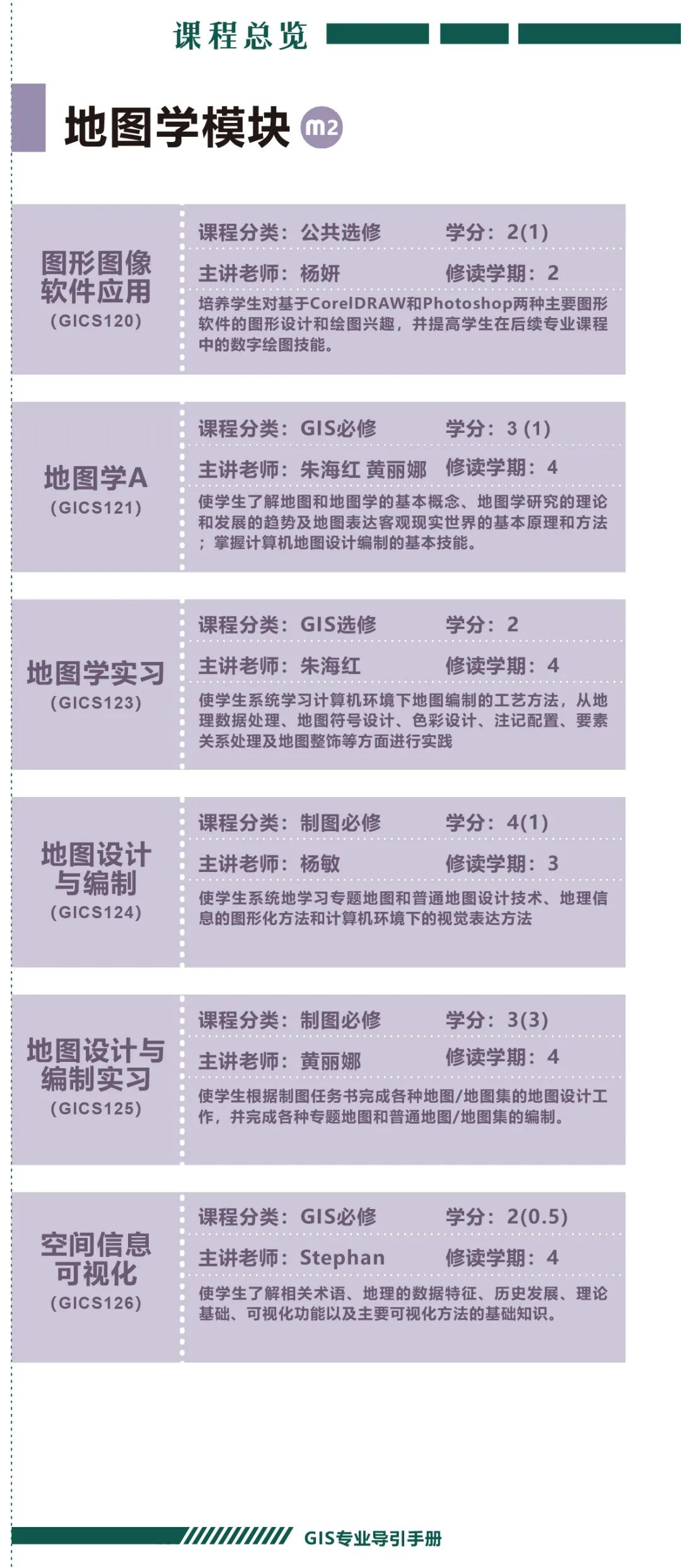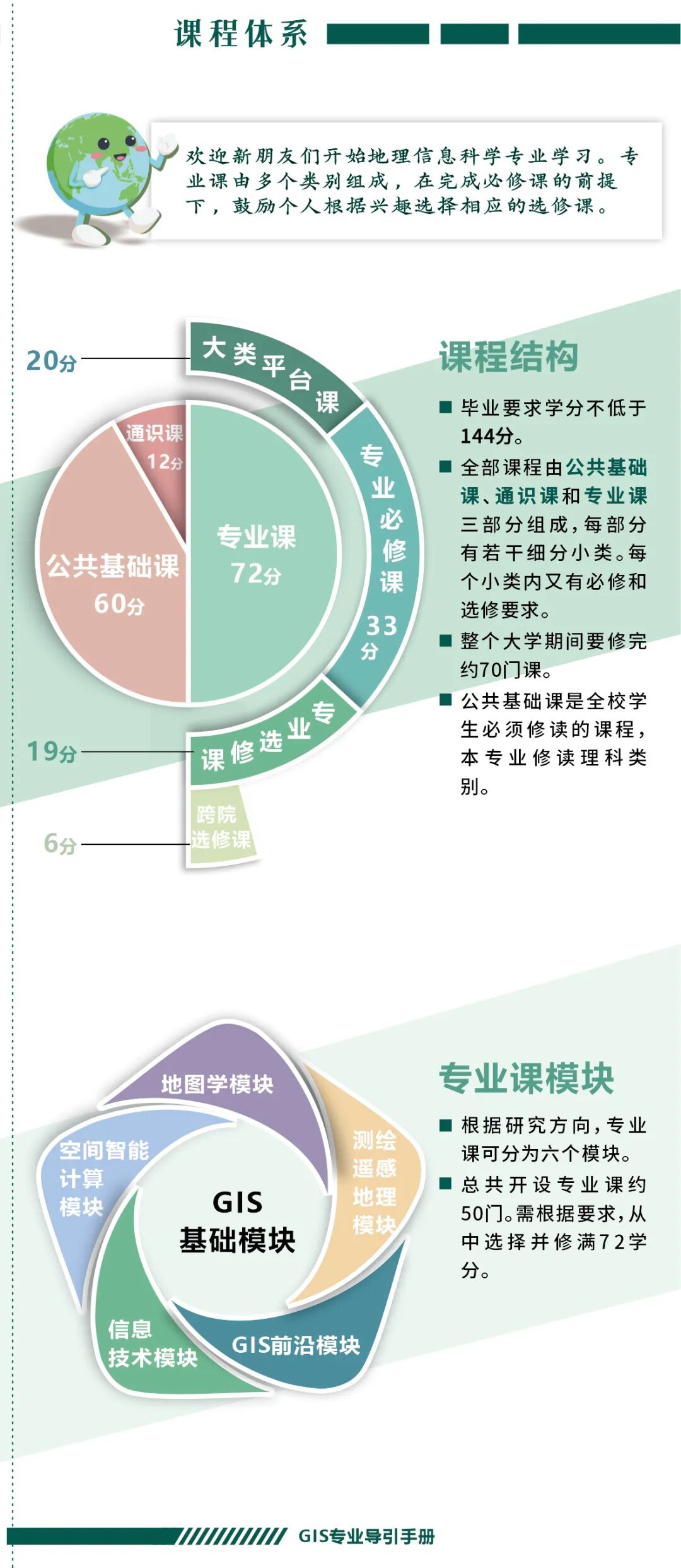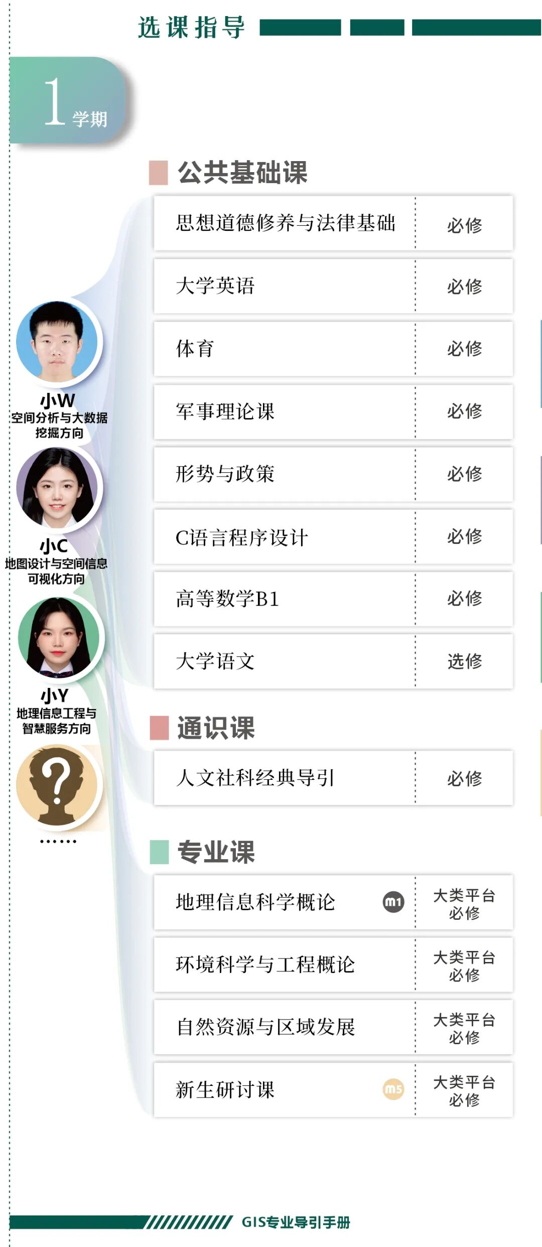 手册为本科生提供课程内容介绍和选课指导,从专业介绍、课程体系出发,详细介绍了地理信息科学专业的课程模块,提供了清晰的课程总览,展示专业强大的师资力量,帮助同学们深入了解专业培养方案和课程体系。