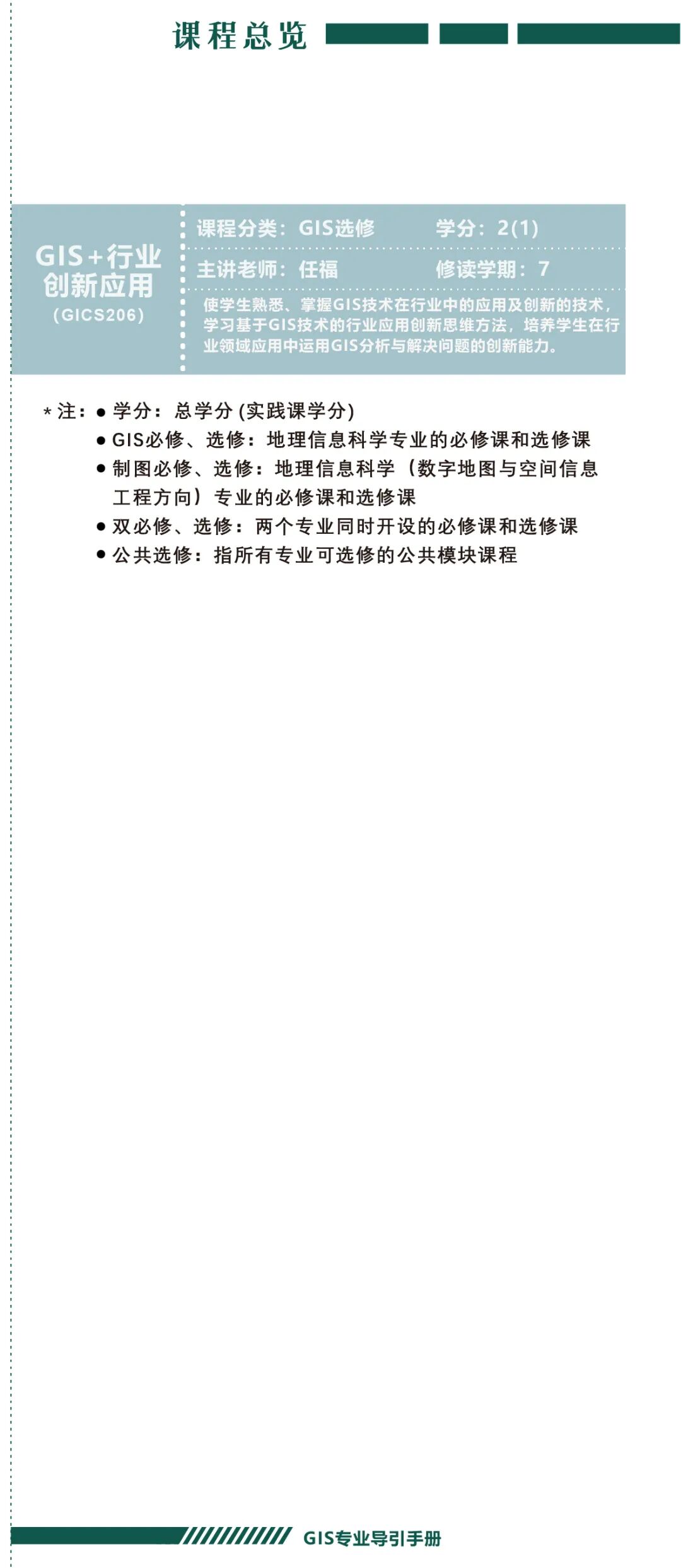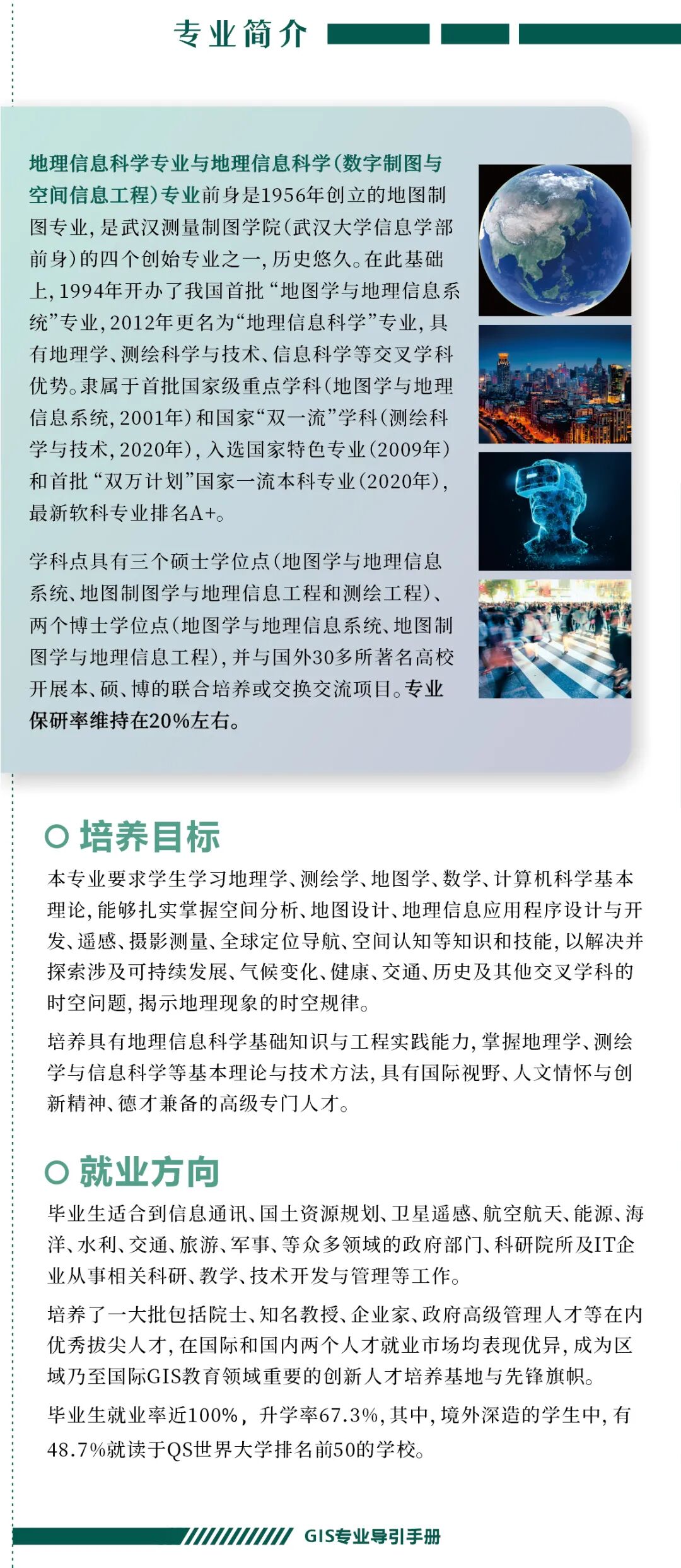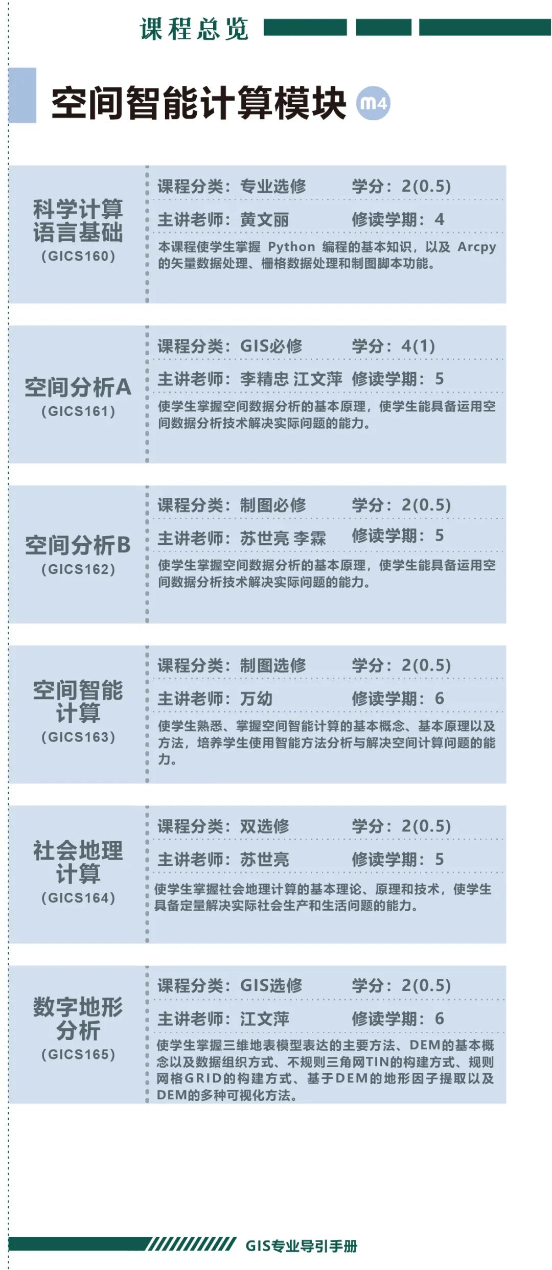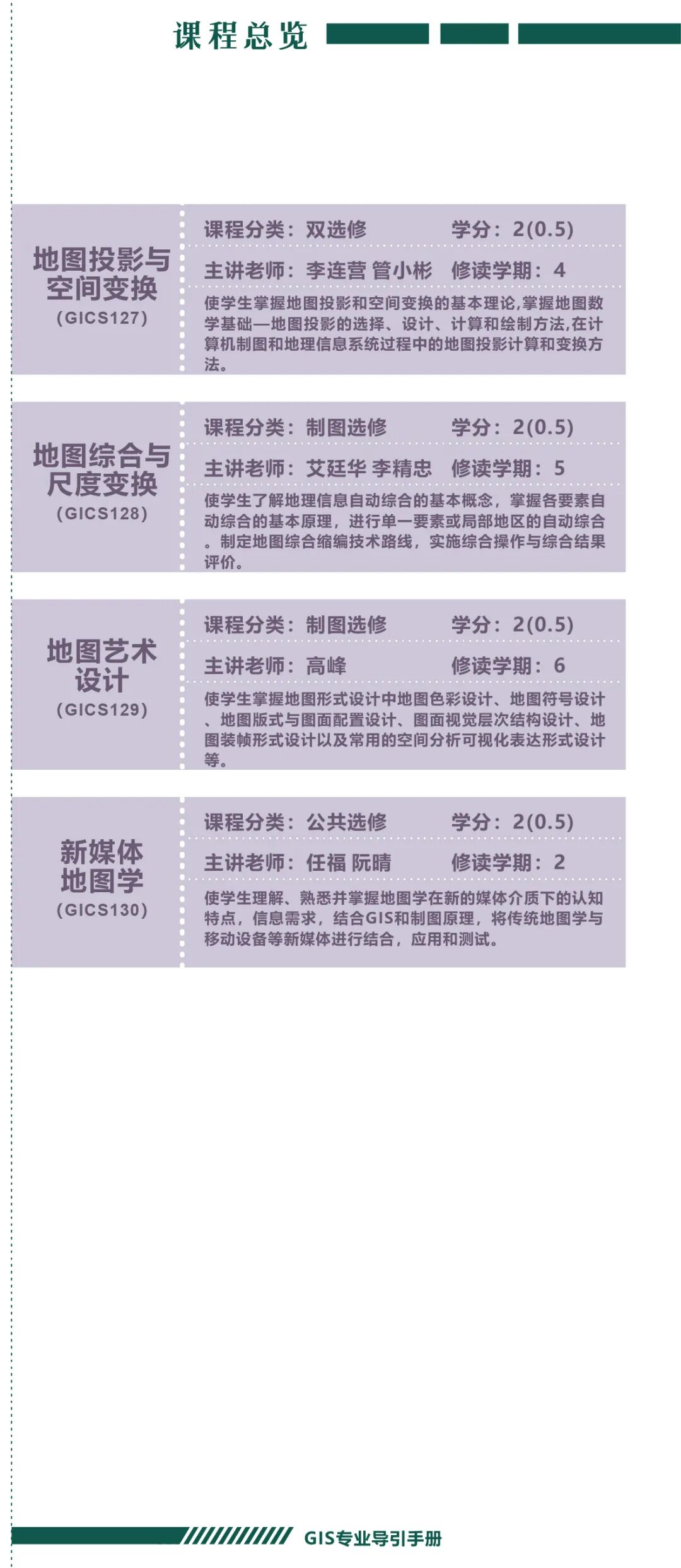 手册为本科生提供课程内容介绍和选课指导,从专业介绍、课程体系出发,详细介绍了地理信息科学专业的课程模块,提供了清晰的课程总览,展示专业强大的师资力量,帮助同学们深入了解专业培养方案和课程体系。