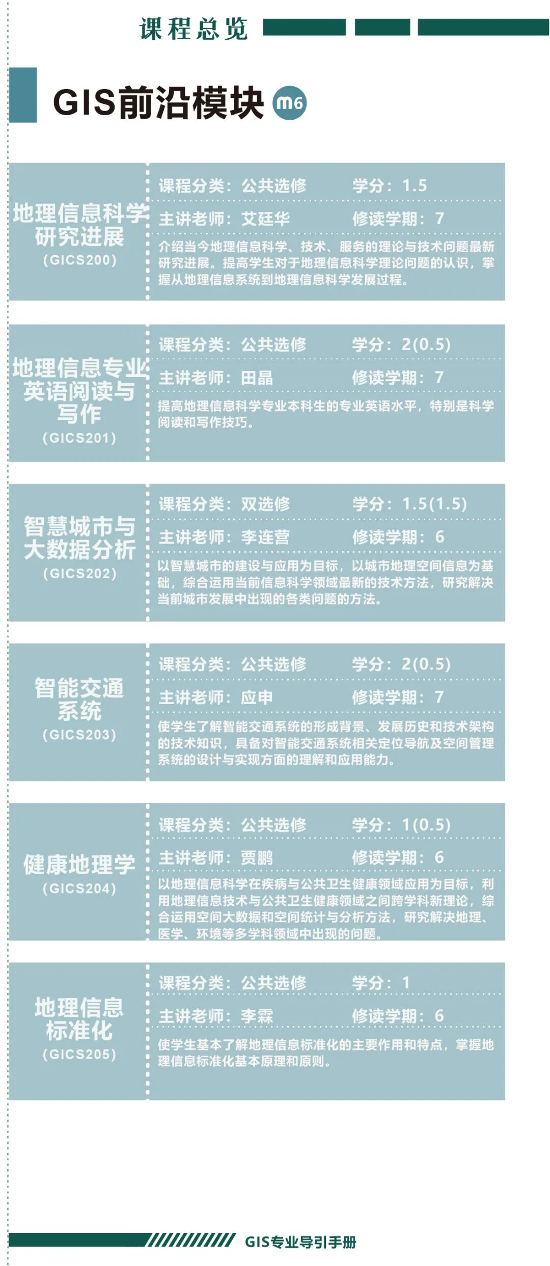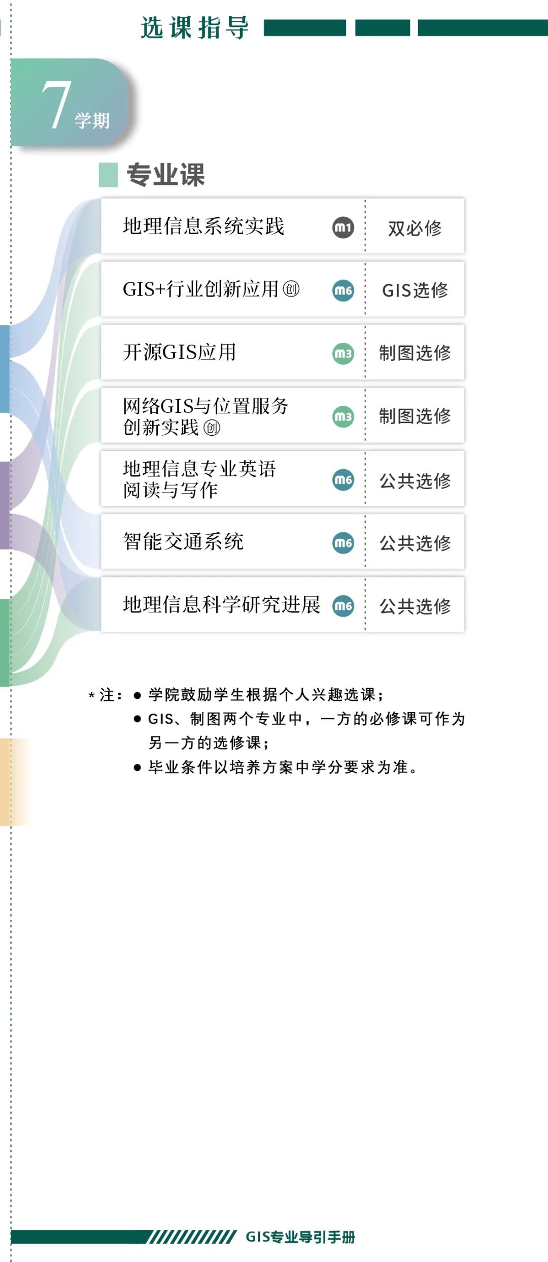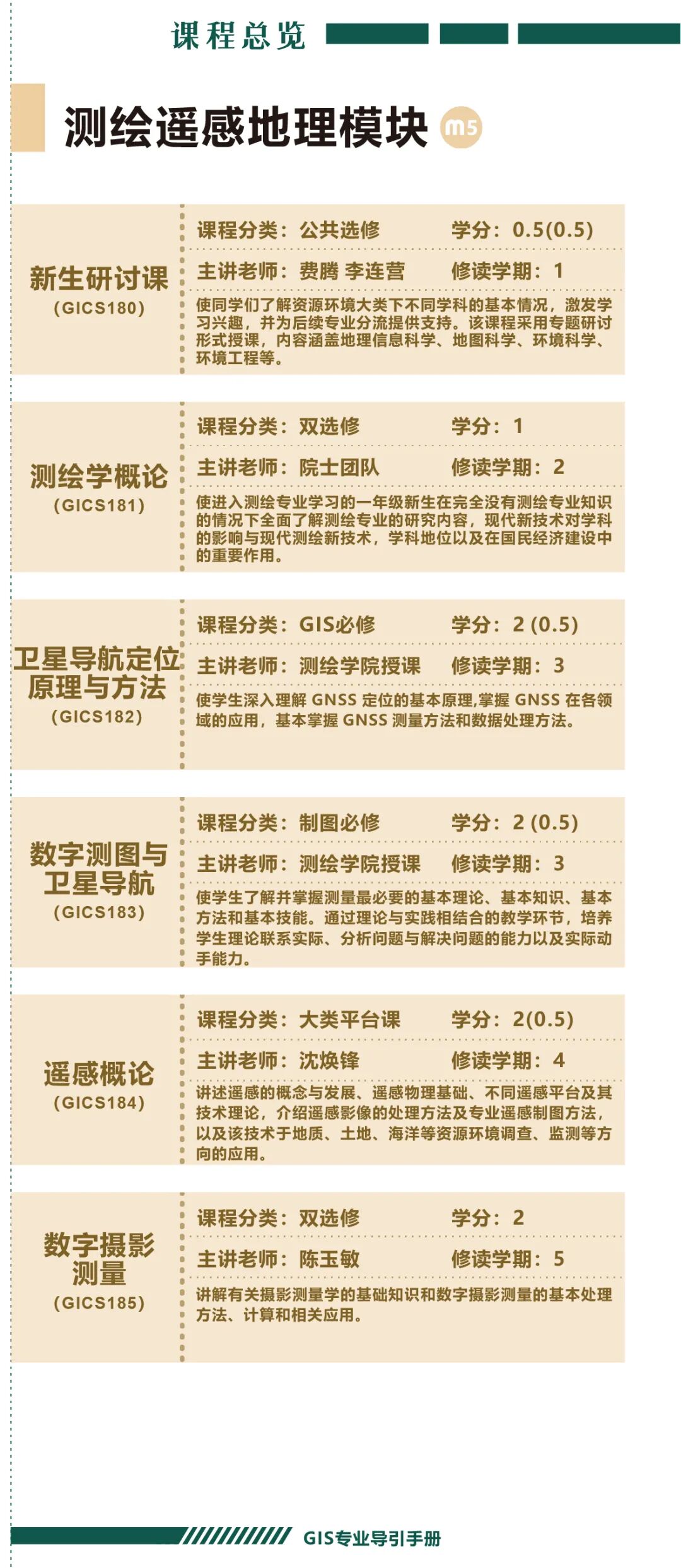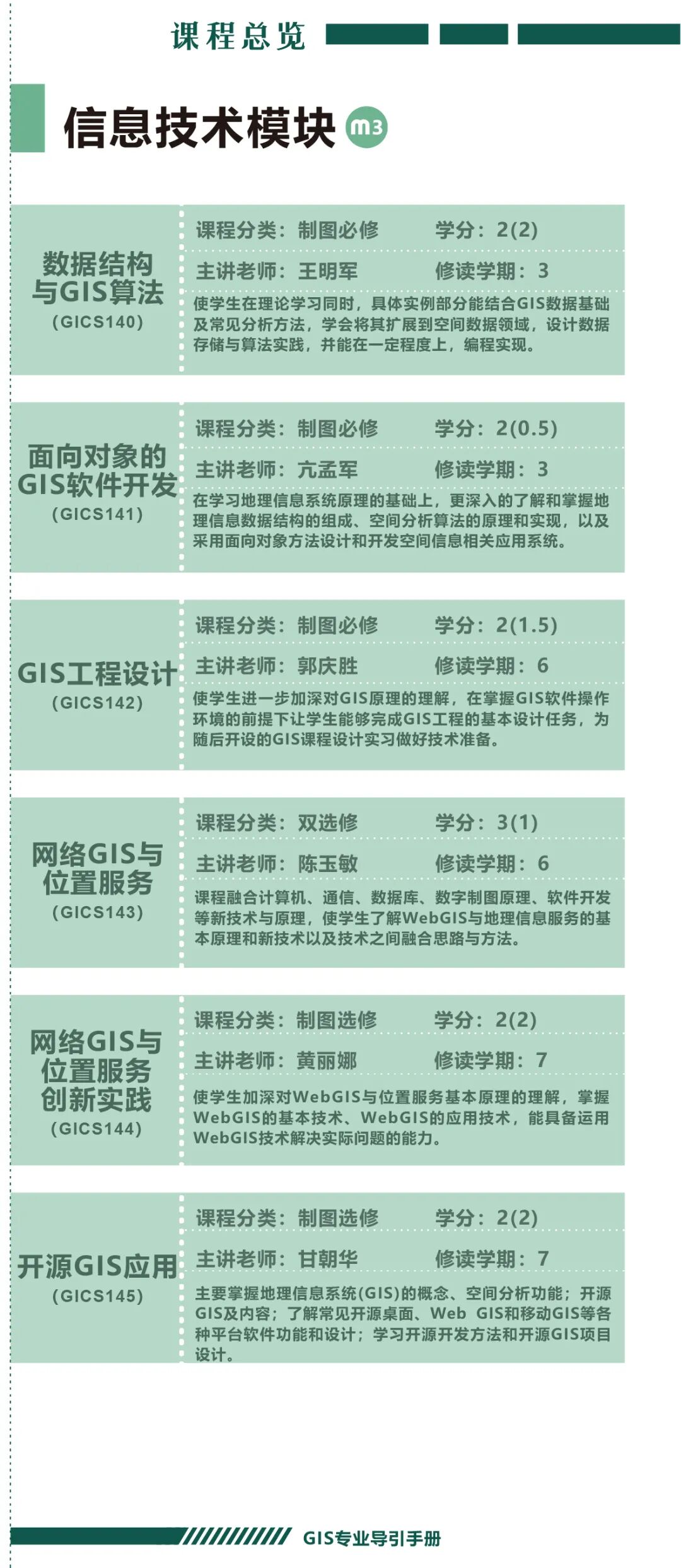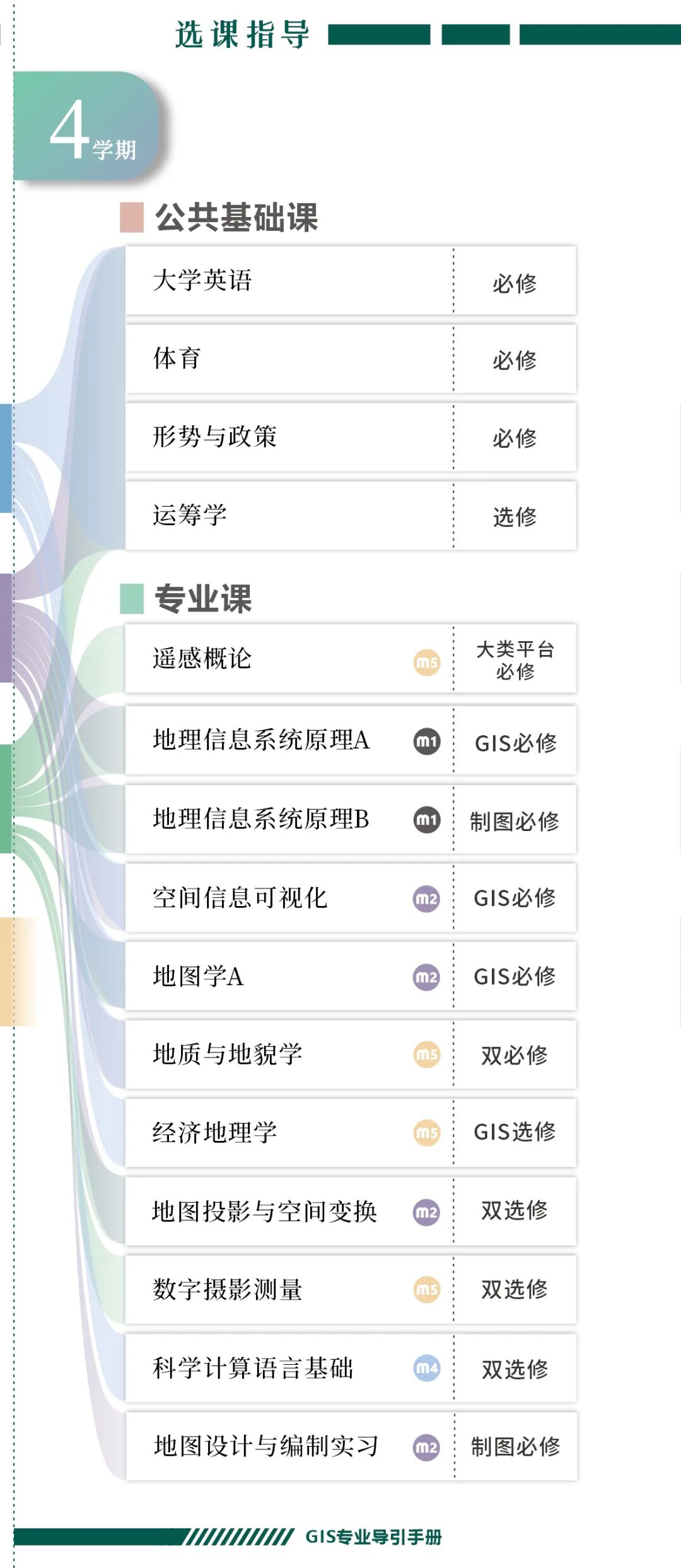 手册为本科生提供课程内容介绍和选课指导,从专业介绍、课程体系出发,详细介绍了地理信息科学专业的课程模块,提供了清晰的课程总览,展示专业强大的师资力量,帮助同学们深入了解专业培养方案和课程体系。