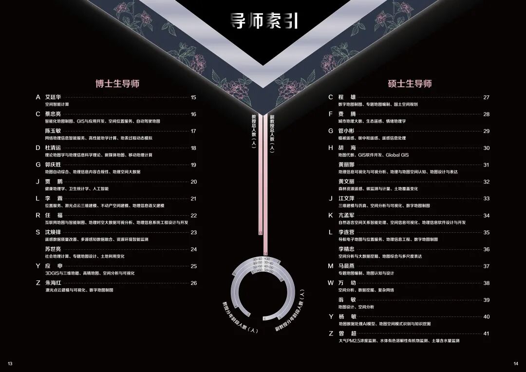图鉴从地理信息科学专业发展历程、学校排名、学科排名、研究方向、师资力量、生源就业与国际交流等方面,对地理信息与地图科学系进行了全面的介绍,同时介绍四大研究方向(地图设计与空间信息可视化、空间分析与地理大数据挖掘、地理信息工程与智慧服务、资源环境智能感知与模拟)的博士生导师和硕士生导师,为研究生选择导师以及进一步确定科研方向提供帮助。