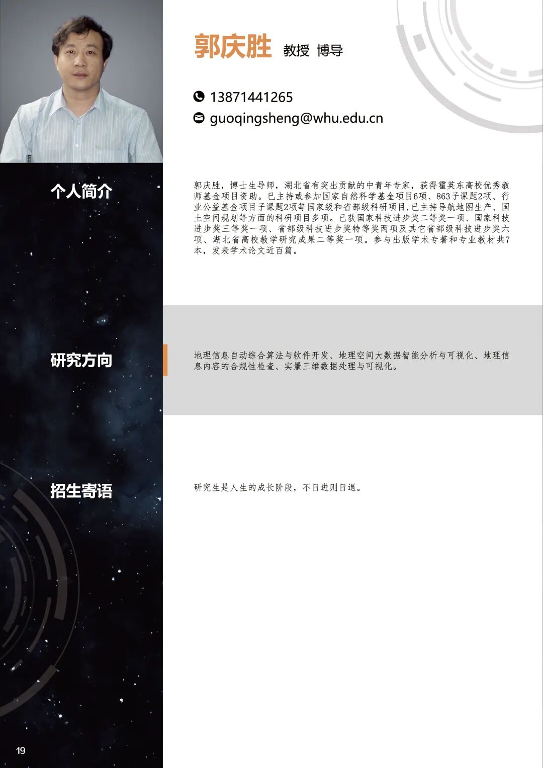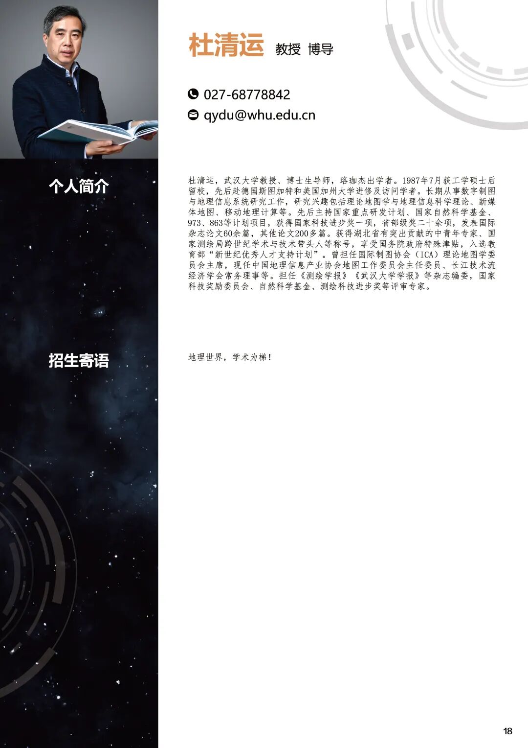 为了更好服务本科生课程学习和研究生导师选择,武汉大学资源与环境科学学院地理信息与地图科学系设计印制了《GIS专业导引手册》和《地理信息与地图科学系研究生招生图鉴》,从全方位直观详细介绍资源与环境科学学院地理信息科学专业。
