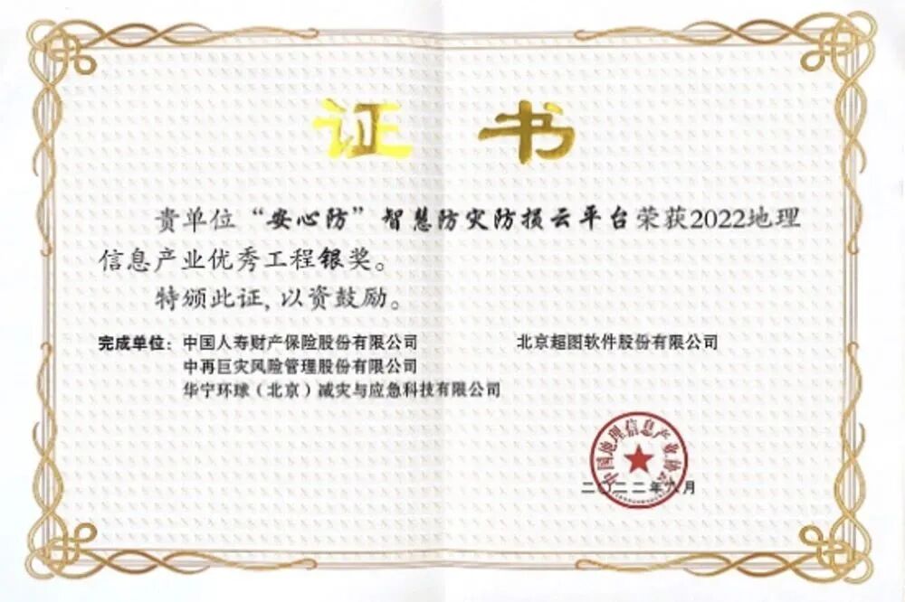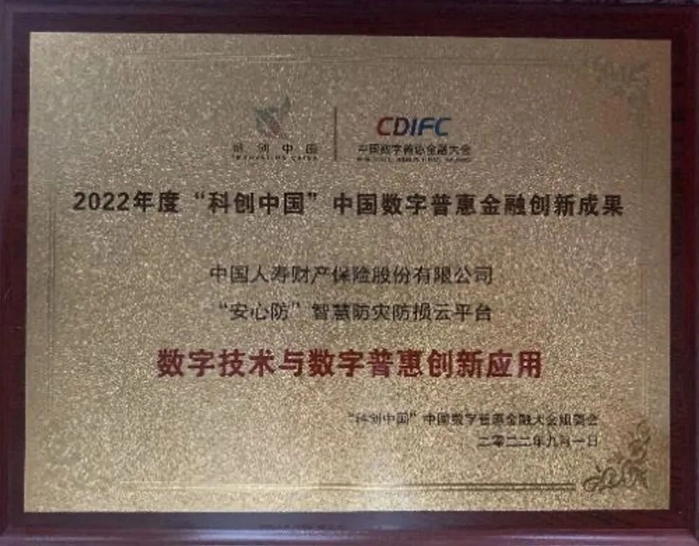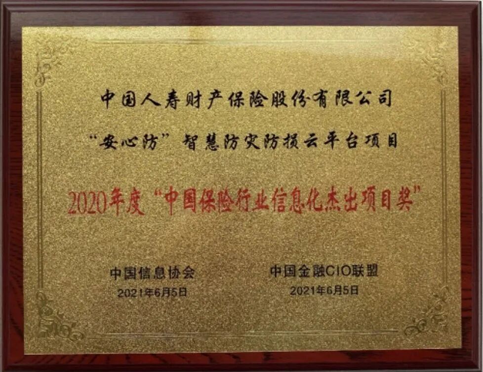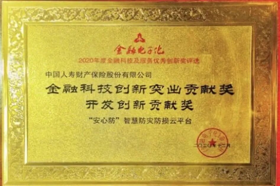 2020年12月,荣获“2020年度金融科技及服务优秀创新奖评选”金融科技创新突出贡献奖、开发创新贡献奖,2021年6月,荣获中国信息协会、中国金融CIO联盟联合2020年度“中国保险行业信息化杰出项目奖”,2022年8月,荣获中国地理信息产业协会2022年地理信息产业优秀工程银奖,2022年9月,荣获2022年度“科创中国”中国普惠金融创新成果暨中国普惠金融先锋榜“数字技术与数字普惠创新应用奖”。