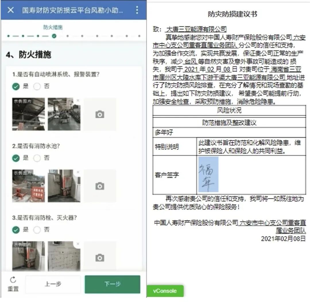 平台可结合风险空间范围及保单属性,为客户提供风险查勘服务,自动化向客户出具风勘报告,向风险隐患客户出具防灾建议书,助力风险前置管理。