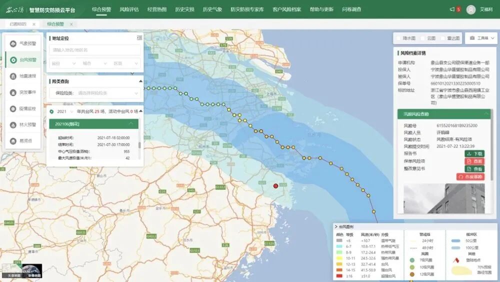 2021年6号“烟花”和7号“查帕卡”台风登陆前,平台根据台风路径提前三天圈定出5436位高危客户,一线理赔服务人员及时联系客户达到现场进行防灾服务,出具防灾建议书近2000份,截至7月26日12时,上海、江苏、浙江、宁波4家分公司,应用理赔风勘小助手排查风险客户1255家(户),对客户单位发送风险提示函822份,重点排查371个工程项目,电话微信通知7299家企业。