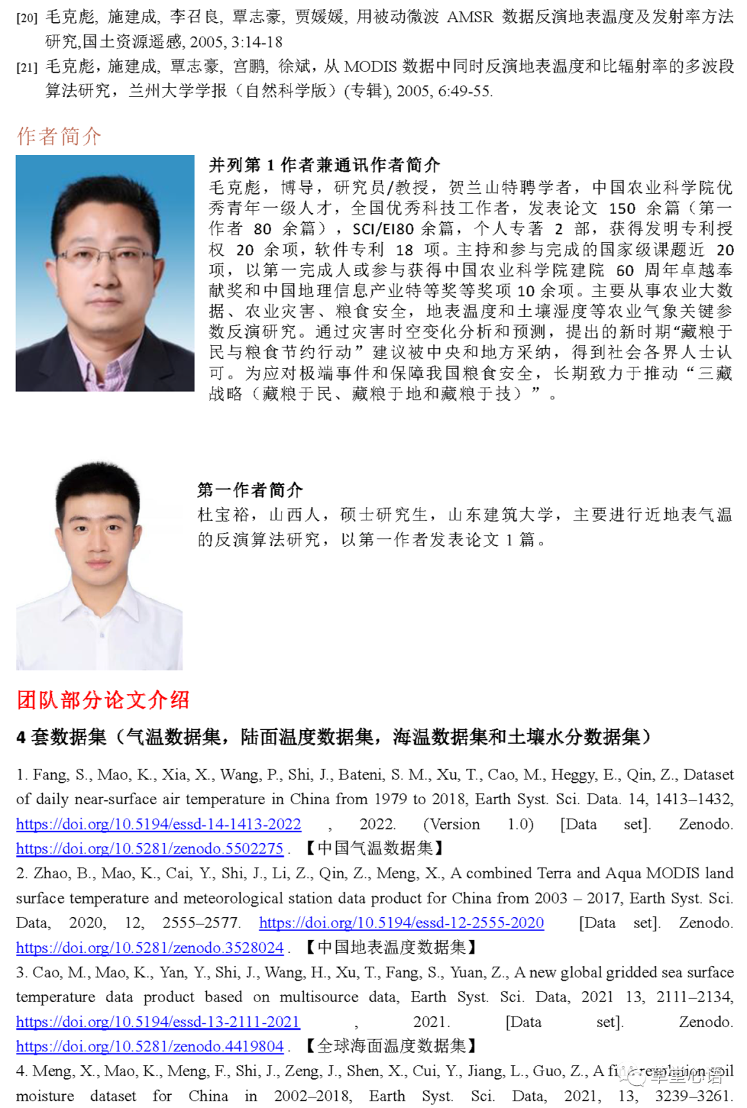 导读:根据我(毛克彪)多年的研究经验,我认为所有的方法都可以看做是不同层次上的统计方法。无论是早期的原始统计经验方法、还是现在大家公认的物理经典模型/方法/算法。如果从不同层次上去看,都可以归结为不同层次上的统计方法。只不过所谓的物理模型/方法/算法是在广大科研人员的努力下发现一些现象或规律取决于某些主要变量,赋予了相关变量的物理含义,具有更广的适用范围,但大部分模型/方法/算法适应范围也不是“包打天下”,很多物理方法适用范围也是相对的,其本质还是统计方法,我把这种方法称之为物理统计方法。这个方法的优点是比前者适用于更大的范围和更具普适性而已;机器学习算法本质上也是统计方法,特别是目前用得比较多的深度学习神经网络算法本质上是一种更高级的统计优化计算方法,这种方法的精度和普适范围取决于样本库(训练和测试数据的代表性和精度)。我最早在2008年提出将深度学习应用于近地表空气温度反演,并且将地表温度和发射率作为先验知识使得算法具备移植性,从理论和技术上进行了突破(①Kebiao Mao, Huajun Tang, Xiufeng Wang, Qingbo Zhou, Daolong Wang, Near-Surface Air Temperature Estimation from ASTER Data Using Neural Network, International Journal of Remote Sensing, 2008, 29(20), 6021-6028;②毛克彪,马莹,夏浪,沈心一,用MODIS数据反演近地表空气温度的RM-NN算法,高技术通讯,2013, 23(5), 462-466;③毛克彪,王道龙,张立新等,从MODIS数据估算近地表空气温度方法,专利号:ZL2009100910294, 2013;④Kebiao Mao, Chunyu Gao, Guicai Li, et al., A Method for Estimating Near-surface Air Temperature From Remote Sensing Data Based on Machine Learning, Patent number: Patent number: 2021105183, 2021. ⑤Kebiao Mao, Huaizhi Zhang, Shu Fang, et al., A High Spatial-Temporal Resolution Method for Near-Surface Air Temperature Reconstruction, Patent number:2021105536, 2021.)。