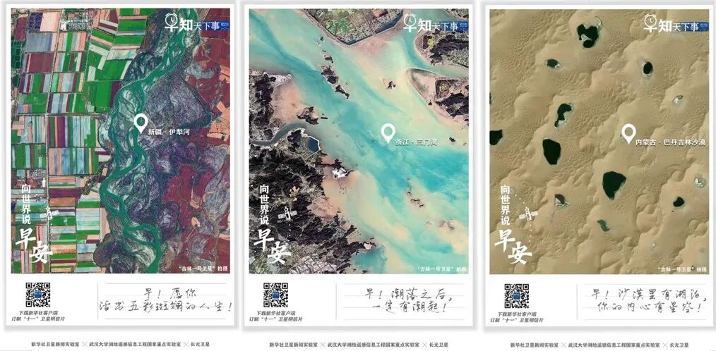 卫星新闻不仅可以做“写实”报道,也可以记录“美”。高分辨率的光学影像在太空俯瞰地球,可以获取人类在地面视角无法看到的震撼画面。张过和新华社卫星新闻实验室发现了卫星影像“壮阔美丽”的艺术欣赏价值,决定将卫星美图用于新华社微信公众号早读栏目。2021年7月起至今,实验室和新华社相关单位、长光卫星公司合作,在“早知天下事”栏目“向世界说早安”板块,以遥感美图+早安问候语的明信片形式,为新华社读者传递问候,从卫星视觉展现祖国大好山河美景;2021年8月至今,在“卫星直击”板块,张过教授团队协助制作新春卫星图壁纸,元宵节 “灯火里的中国”等展示现代化中国美丽画卷的卫星新闻产品,得到网友们的纷纷点赞,通过遥感美图提升遥感新闻的影响力。该项目主要参与人硕士生关晴说:“仰望星空,才知自我渺小。我们期待邂逅如星空一般浪漫绚丽的生活,却不得不正视一地鸡毛的生活。借助卫星,可让视角升腾到万米高空之上,巡游全球极美之地,视角打开了,心就打开了。”