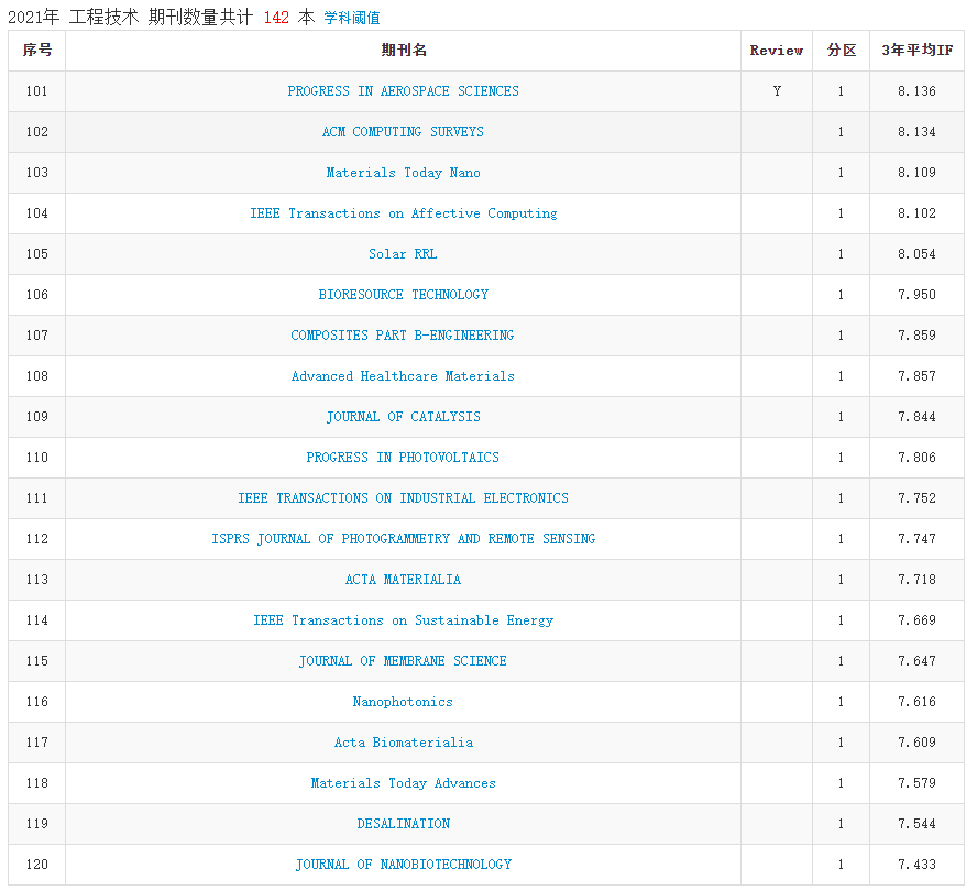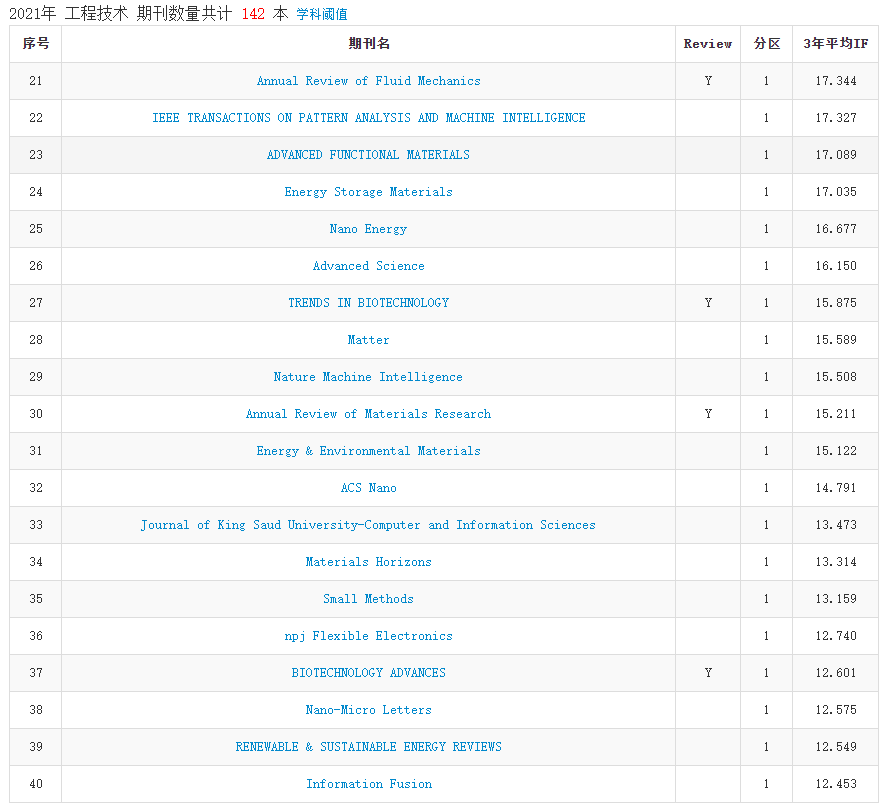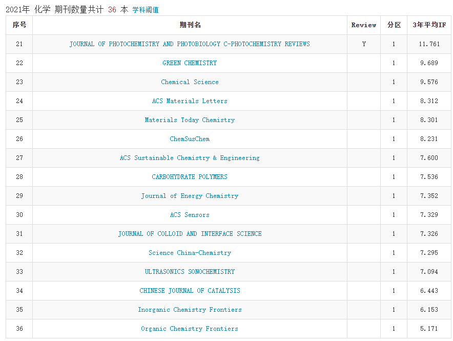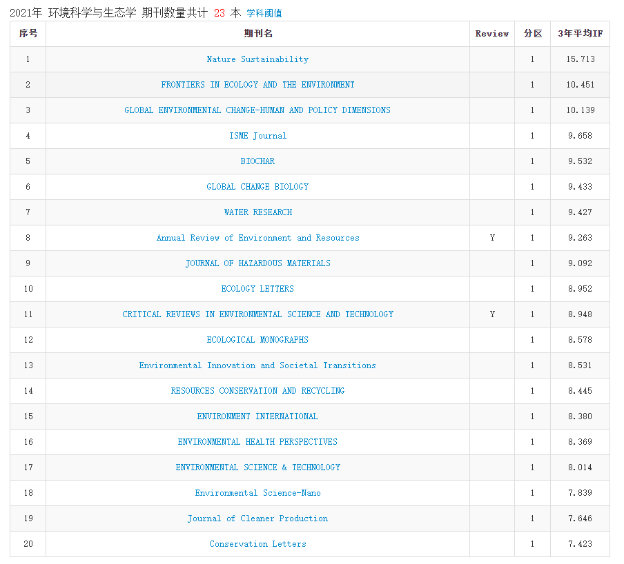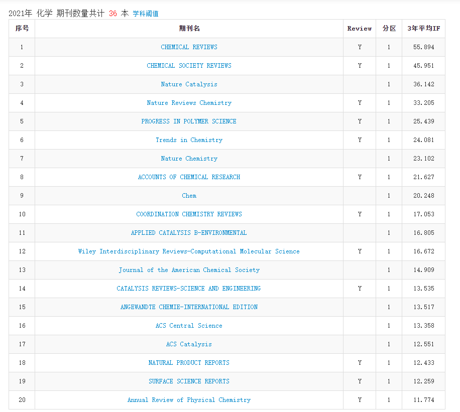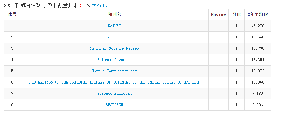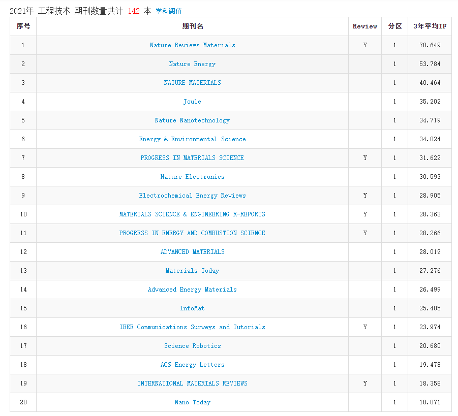1、今年是发布基础版的最后一年,2022年起将只发布升级版。所以2022年开始,大家不必再纠结是看基础版还是升级版,科研评价更加明确。2021年期刊分区表收录期刊为自然科学期刊(SCIE)、社会科学期刊(SSCI)和ESCI收录的中国期刊(自科+社科) 。2021年期刊分区表,通过期刊引用关系生成学科结构,参考了国务院学位委员会、教育部印发《学位授予和人才培养学科目录(2011)》的学科内涵和外延,设置18个大类:数学、物理与天体物理、化学、材料科学、地球科学、环境科学与生态学、农林科学、生物学、医学、心理学、计算机科学、工程技术、管理学、经济学、法学、教育学、人文科学和综合性期刊。注:人文科学,只包括被SCIE和SSCI收录的哲学、历史、语言学和新闻传播学期刊,未囊括 A&HCI 的期刊。1. 国产期刊继续扶持,National Science Review、Science Bulletin依然是综合性期刊一区;2. 两大化学综述期刊Chemical Review和Chemical Society Review依然霸榜化学类期刊前两名,新刊Chem在化学类非综述期刊中,仅次于Nature Catalysis和Nature Chemistry,超越JACS和Angew;4. Nature Energy近三年平均影响因子53.784,在工程技术类非综述类期刊第一名;第一名为Nature Reviews Materials,近三年平均影响因子70.649;5. Joule入选工程技术类第四名(去年第六),仅次于Nature Reviews Materials,Nature Energy和NATURE MATERIALS,高于Nature Nanotechnology;6. Nature Sustainability在环境科学与生态学类别中排名第一!7. Research去年是四区,今年直接变成一区!综合性期刊