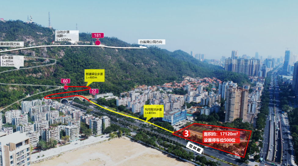 板樟山步道终点联通至景山公园及城市阳台,通过步道及缆车连接至山下城市阳台商业综合体及景山公园出入口,该处将结合地下空间建设约900个车位大型停车场。