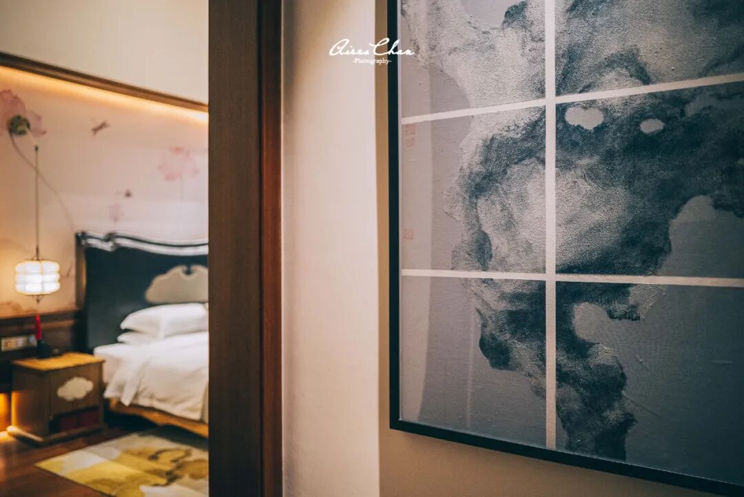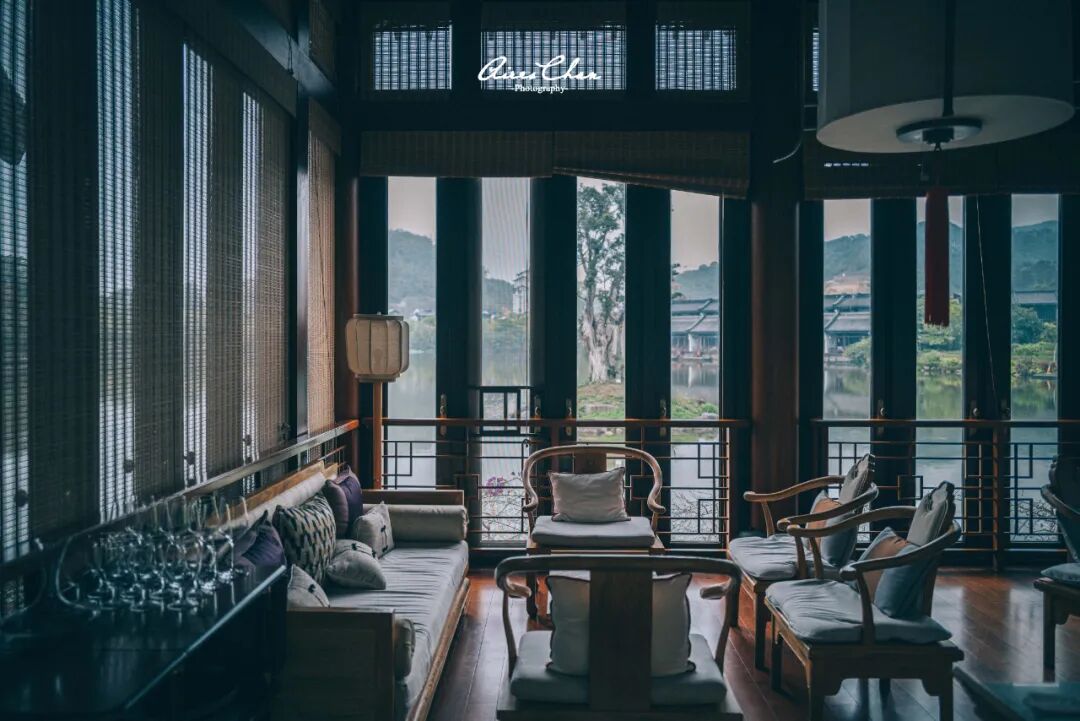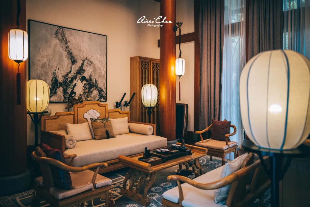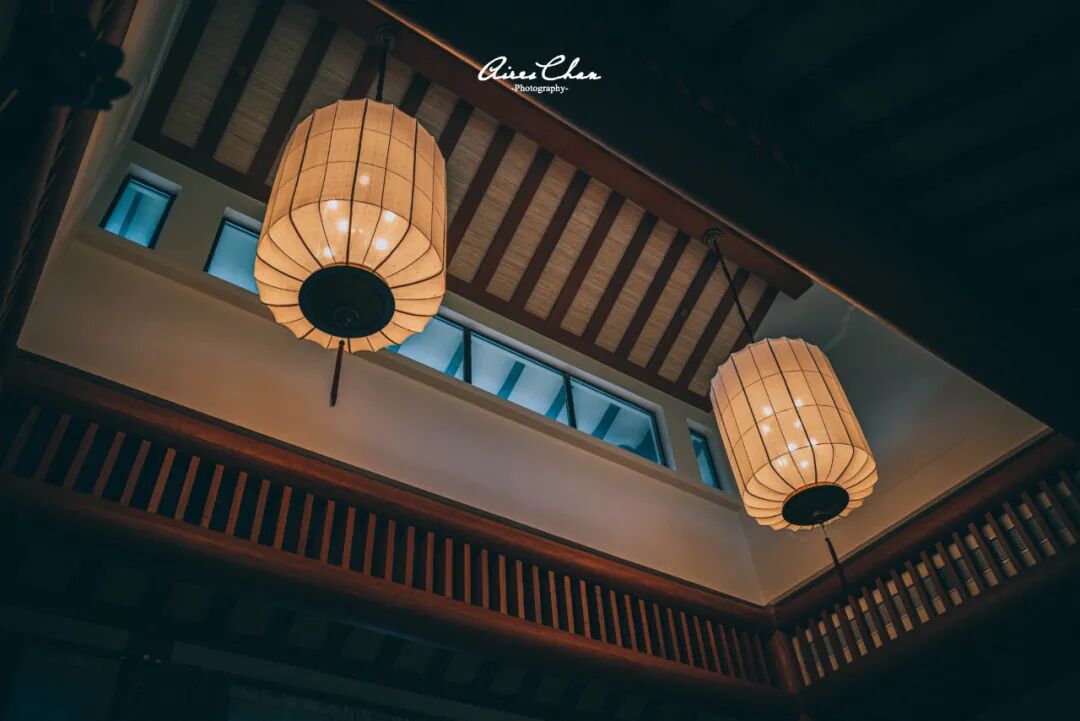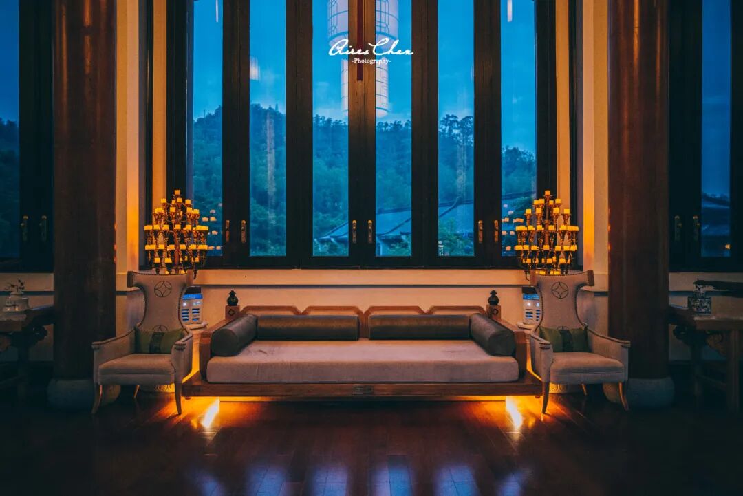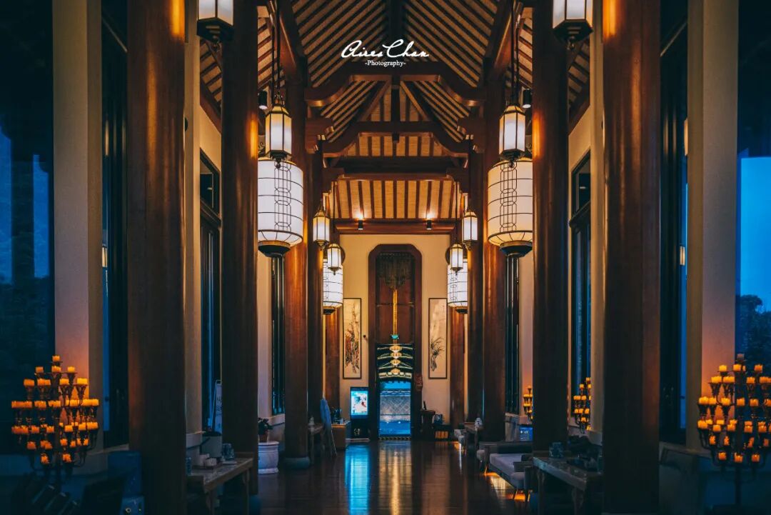 雨来堂的挑高加上人字形屋顶,到了傍晚看还真有一种哥特式教堂的错觉(仔细看还有烛台造型的灯),不过挂在墙上的水墨画、大灯笼造型的吊灯以及粗壮的木支柱,时刻提醒你是一座漂亮的中式酒店大堂。