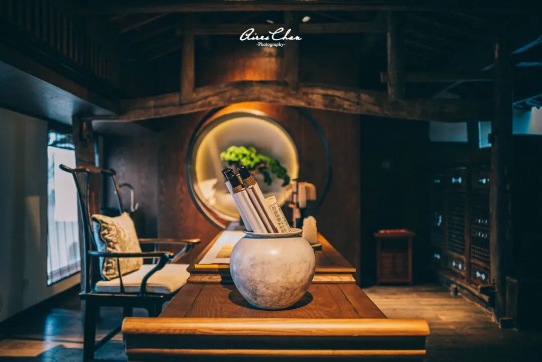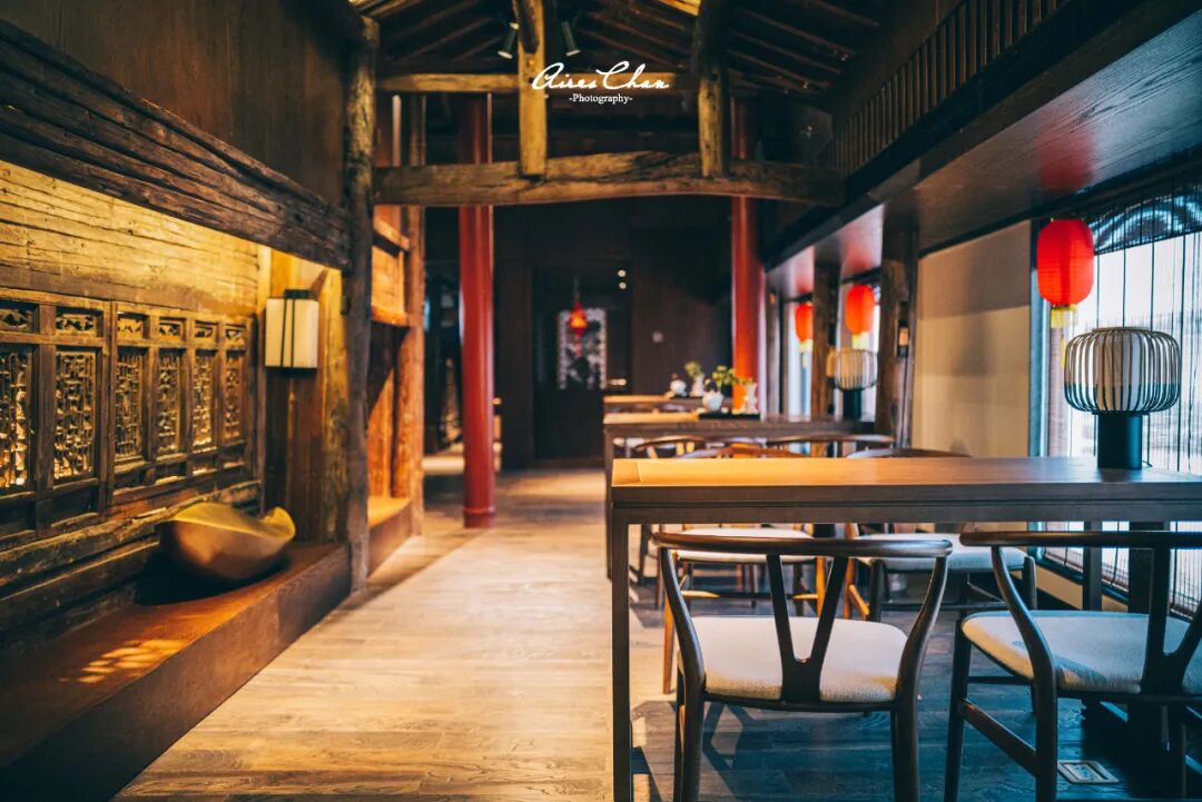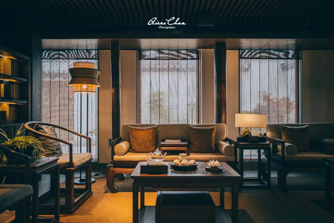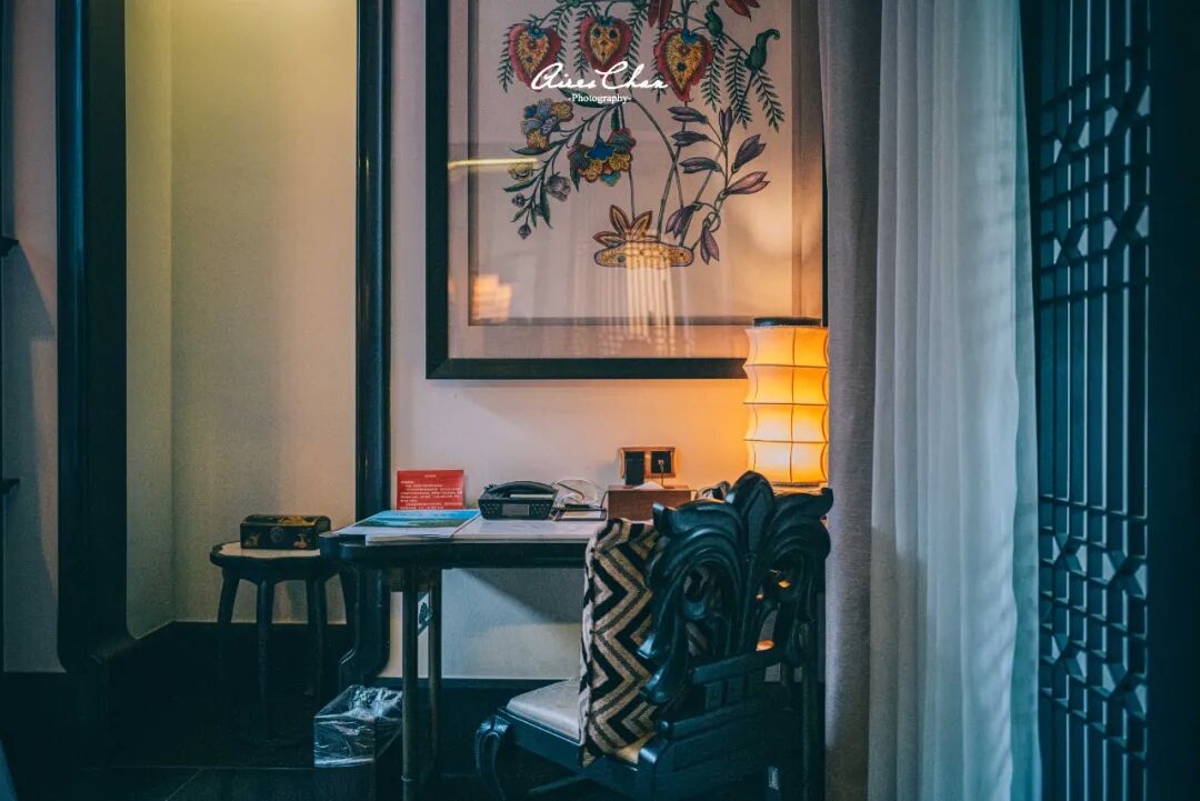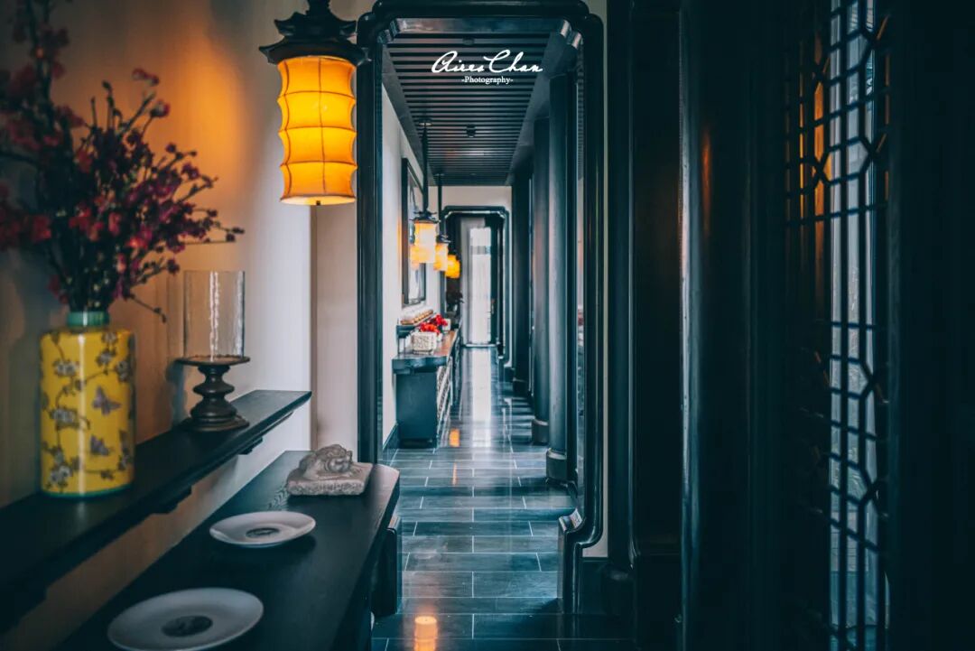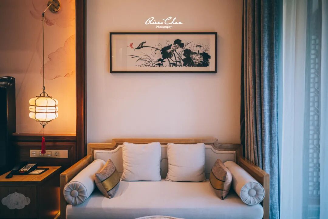 雨来堂的挑高加上人字形屋顶,到了傍晚看还真有一种哥特式教堂的错觉(仔细看还有烛台造型的灯),不过挂在墙上的水墨画、大灯笼造型的吊灯以及粗壮的木支柱,时刻提醒你是一座漂亮的中式酒店大堂。