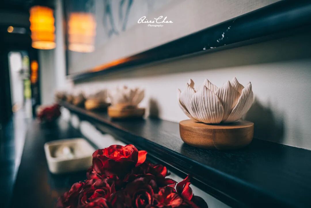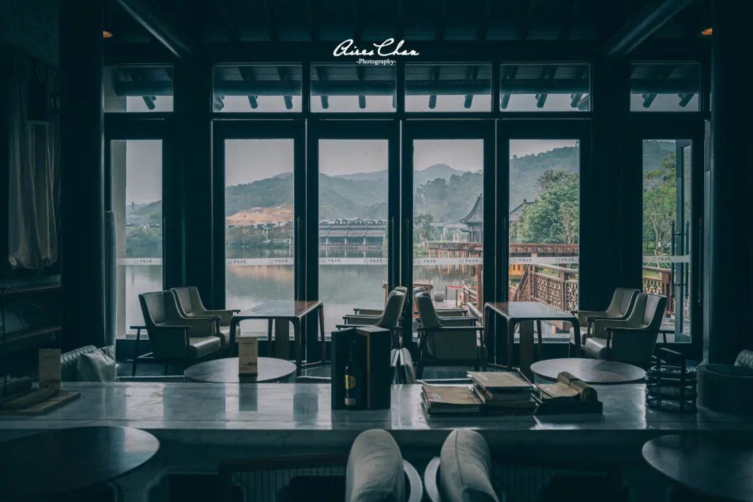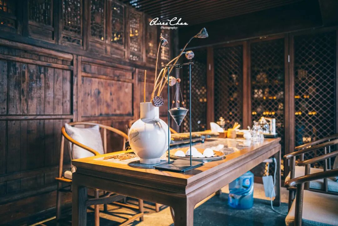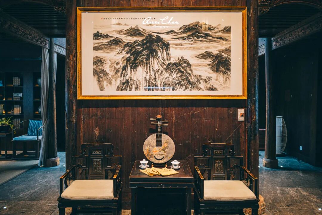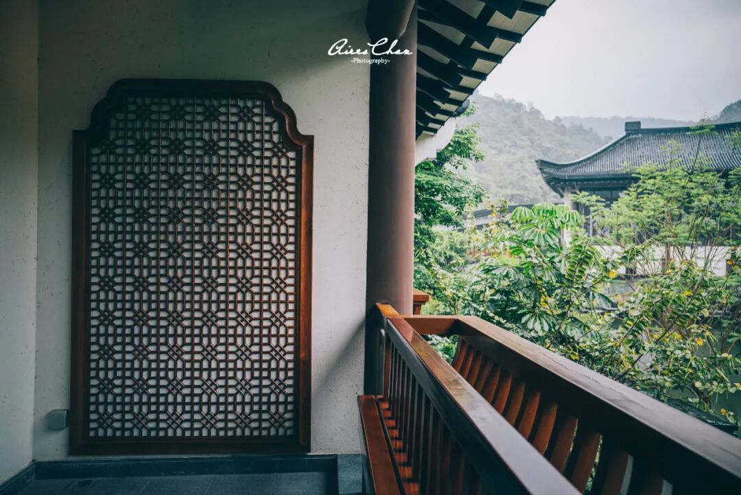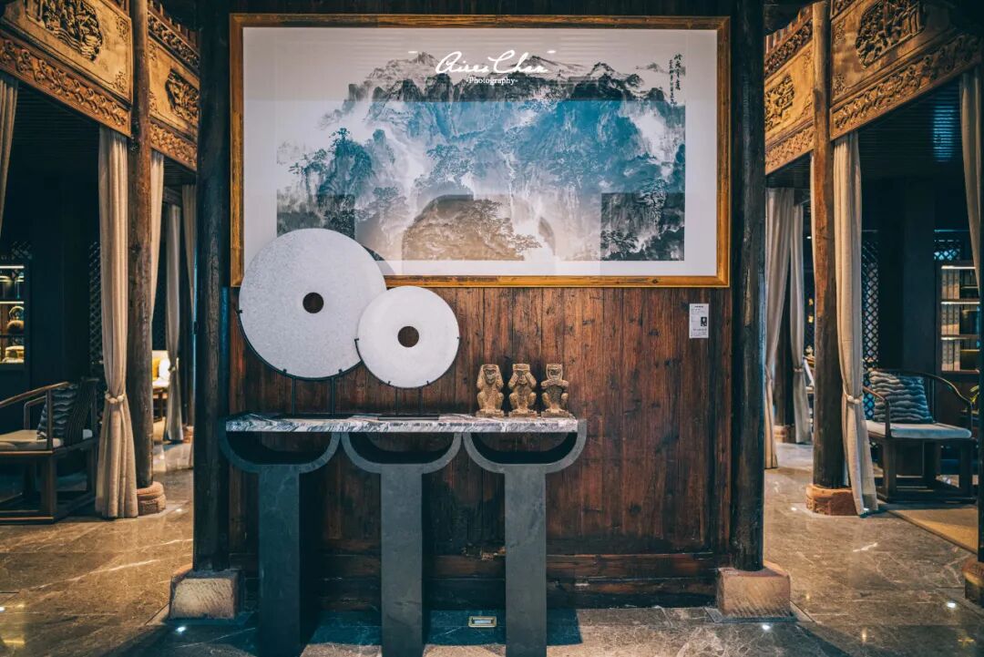 雨来堂的挑高加上人字形屋顶,到了傍晚看还真有一种哥特式教堂的错觉(仔细看还有烛台造型的灯),不过挂在墙上的水墨画、大灯笼造型的吊灯以及粗壮的木支柱,时刻提醒你是一座漂亮的中式酒店大堂。