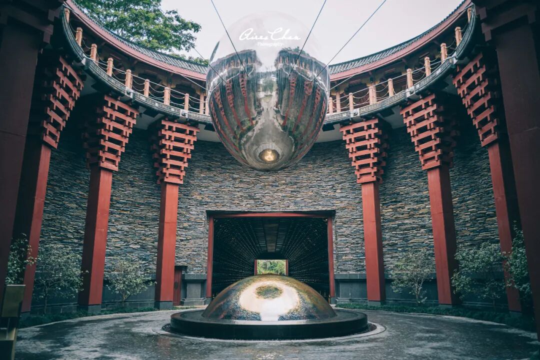 酒店的「开场白」就非常震撼了,是一条长长的时光隧道,两个悬挂式的不锈钢球体就像巨大的水滴,前呼后应,寓意滴水千年。这条造价上亿的时光隧道,连接着门外车水马龙的繁华喧嚣以及度假村内的自然宁静,「穿越」进去恍若穿越千年来到了一世外桃源。
