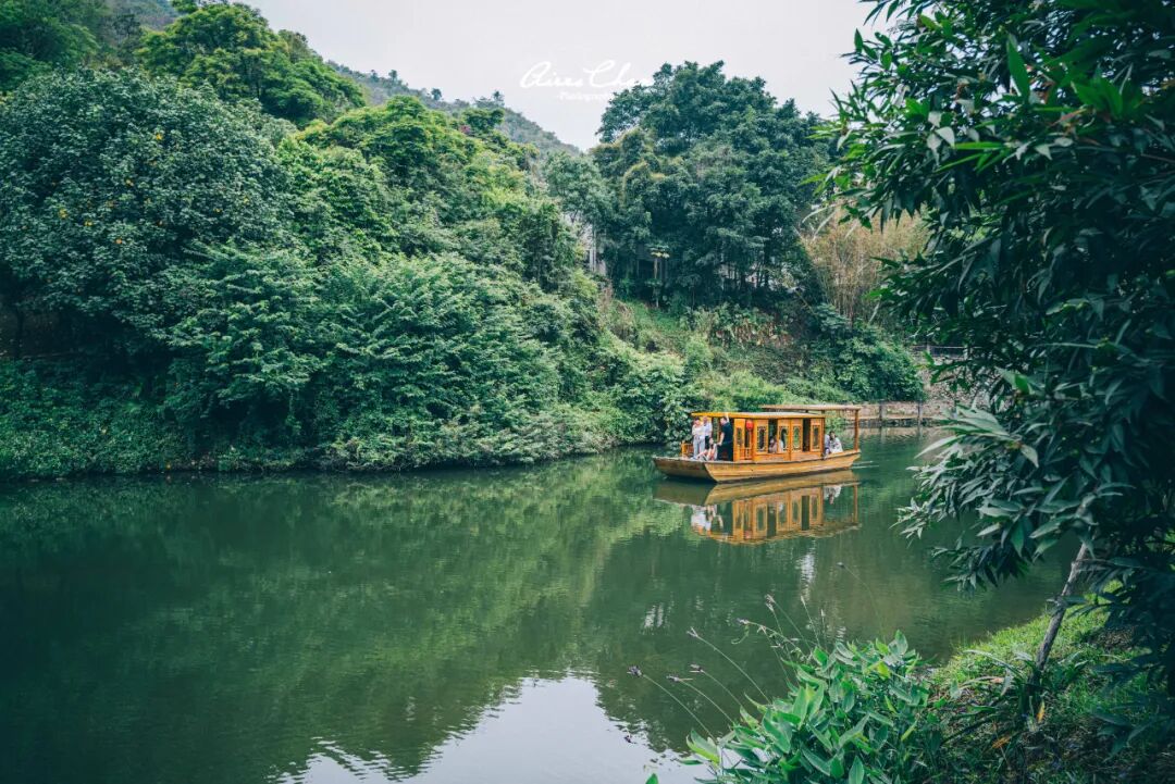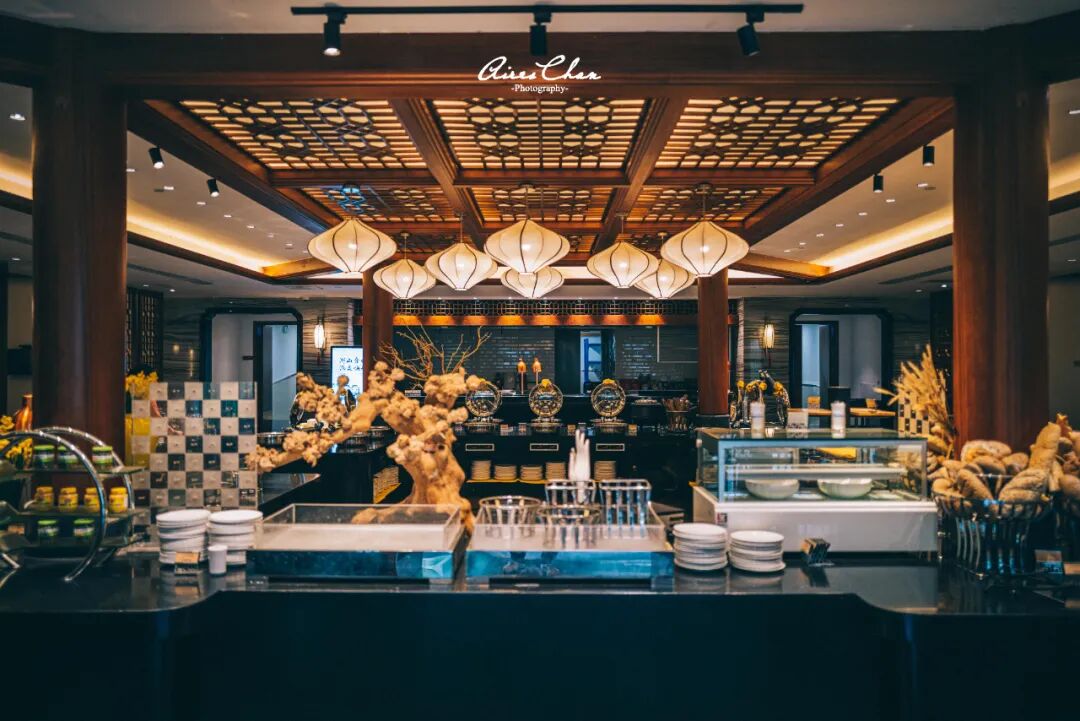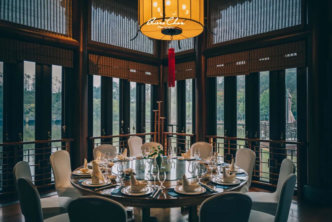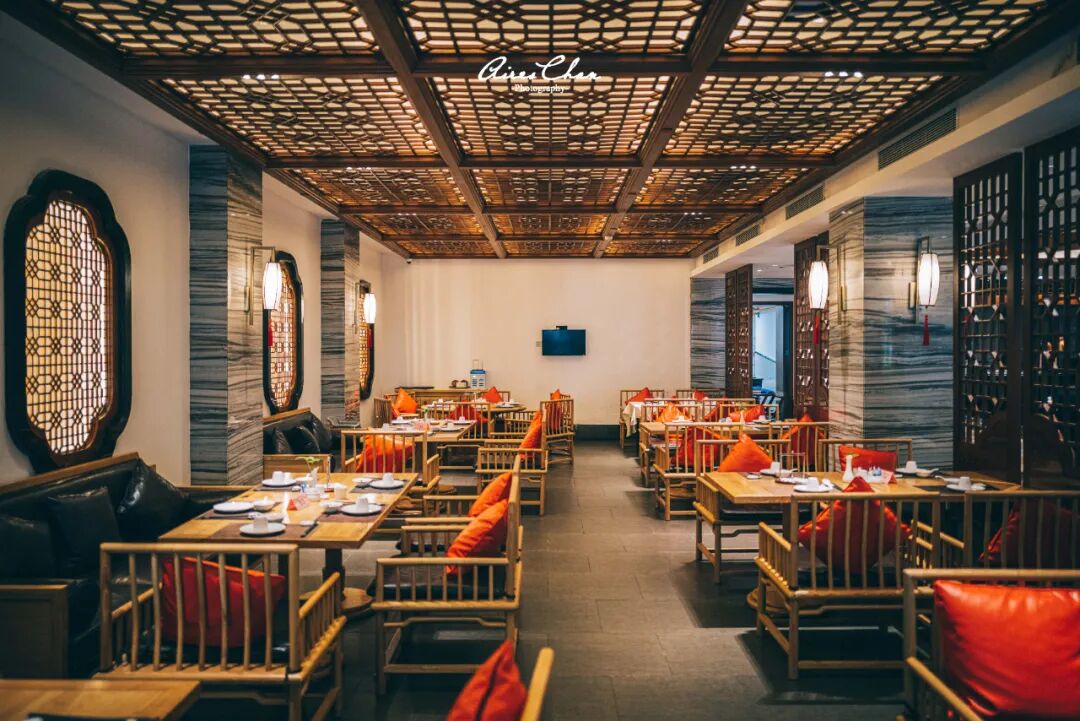 再来说一下酒店的餐厅。酒店一共有三家餐厅和酒店吧,分别是「满庭芳」「东坡馆」和「御风船坞」。先说满庭芳吧,餐厅在飞虹宫区域,楼下有一个小码头,你可以从别墅区或者门口的船坞坐乌篷船到这里吃饭,这乌篷船和乌镇的船一模一样。