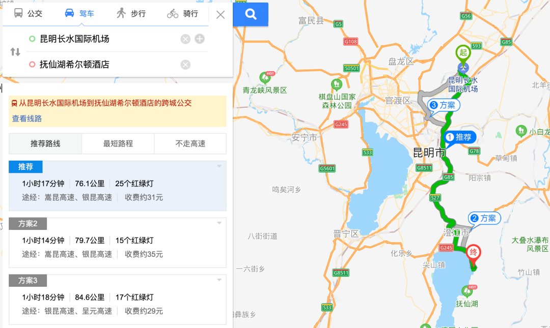 抚仙湖希尔顿在抚仙湖的东北方向,从昆明机场过去不到80公里 ,之前我是在机场租车自己开过去的,大概花了1个小时左右吧,当时因为航班延误到得还很晚,不过一路上路况都挺不错的,半夜开都没问题,更别说大白天了。