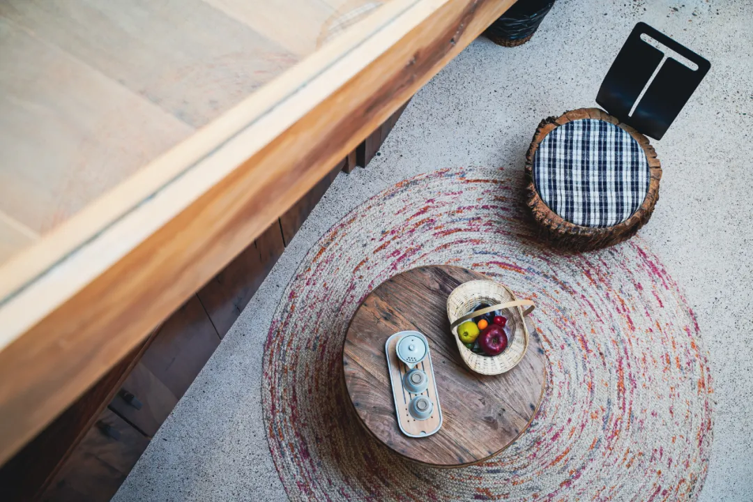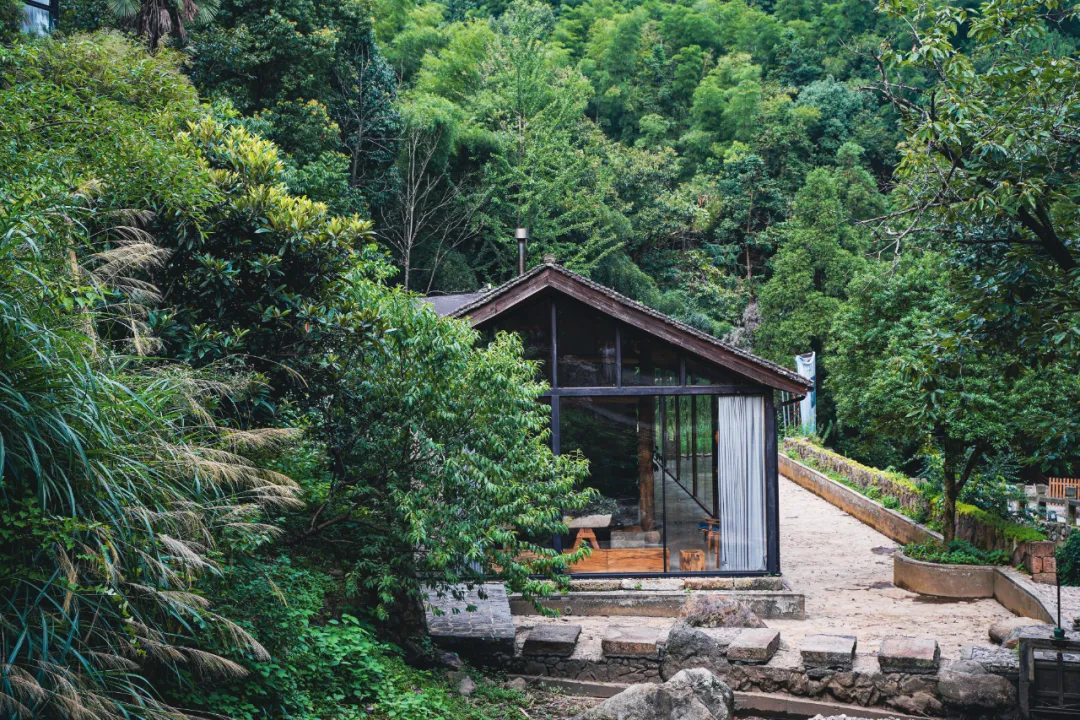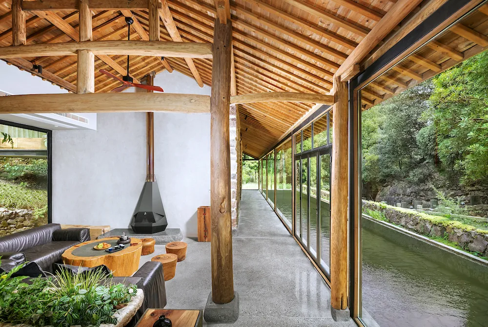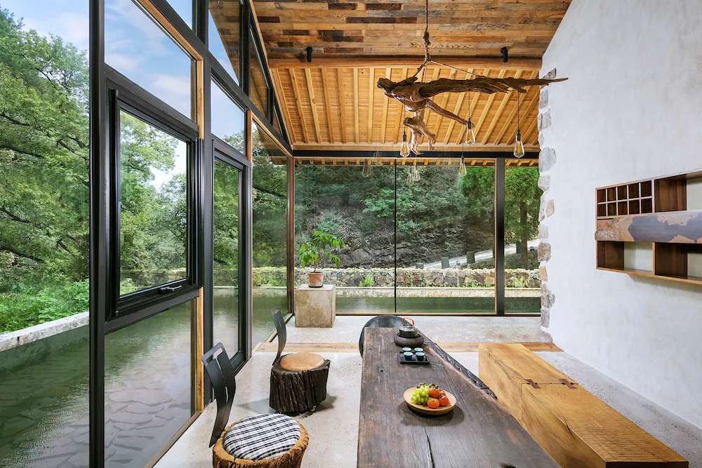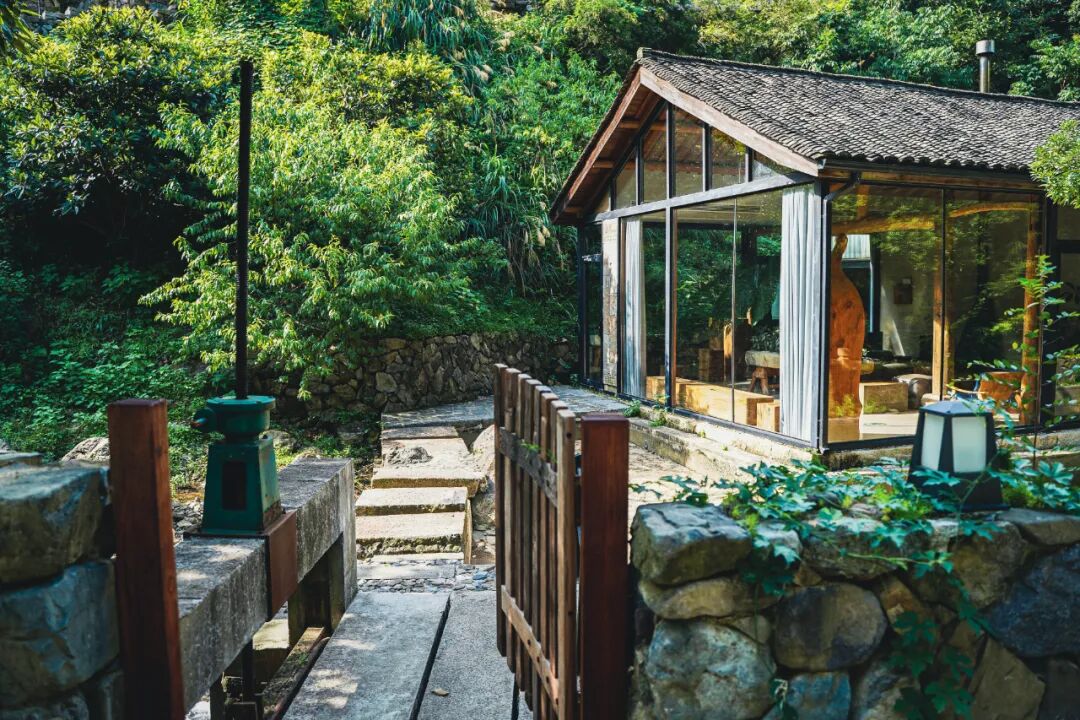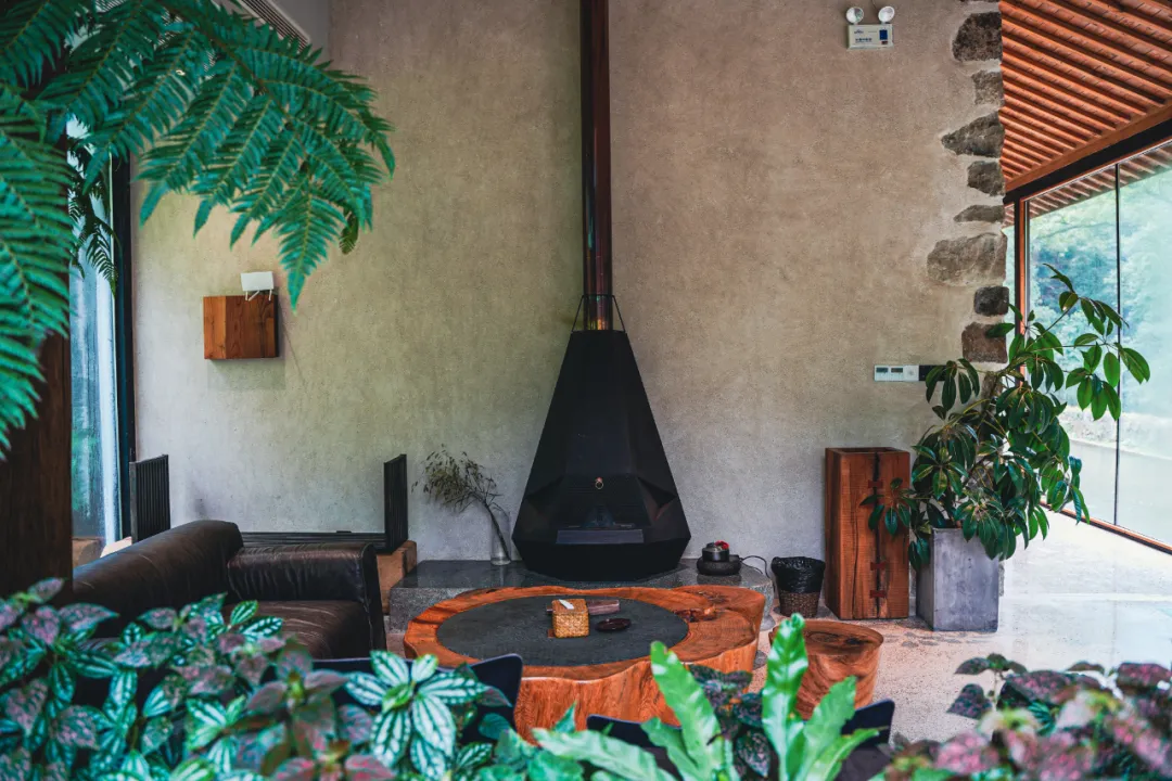 屋外是溪流,推开木门,迈过一小段汀步才到门口,先进入一个布满绿植的客厅。刚入门,就能闻到淡淡的怡人木香,整个空间是用大面积落地玻璃窗构建起来的,所以非常通透,左侧靠山,右侧见水,就像置身于山野里,四时景异。