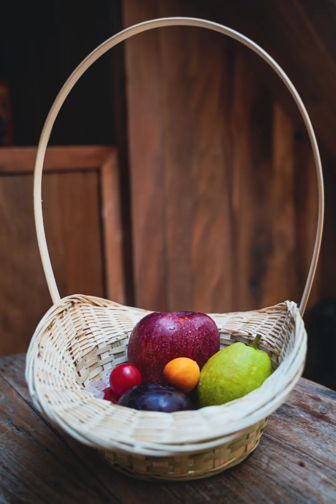 欢迎水果装在一只竹提篮里,跟房间整体氛围也很搭,里面有梨子、蛇果、提子等等,种类还蛮丰富的。