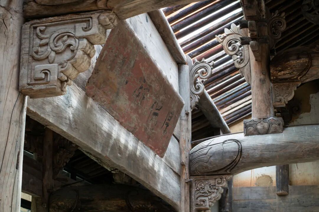 再往里一点,就能看到「生花书院」门口两座标志性的雕像。书院的建筑依旧保留了有几百年历史的榫卯结构木梁,房梁中央悬挂着颇具沧桑感的牌匾。