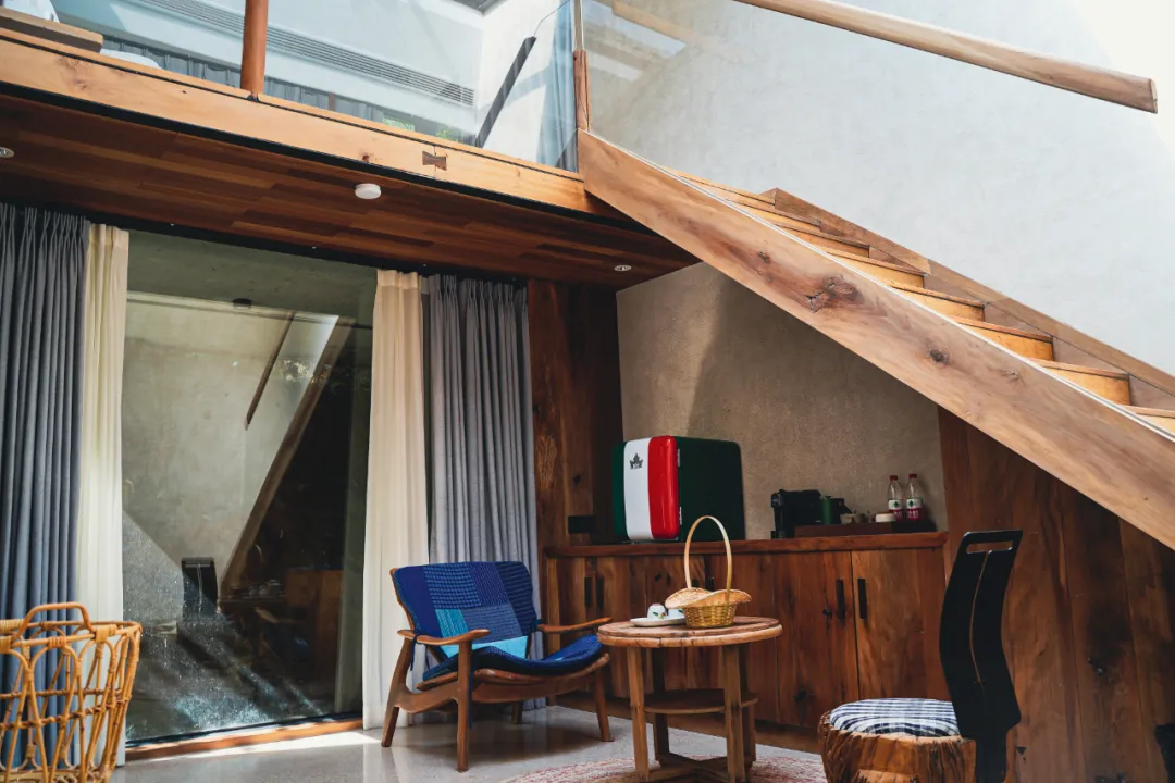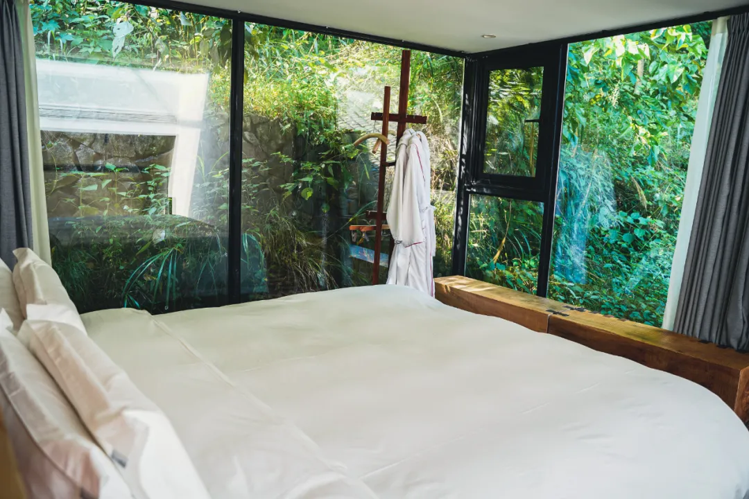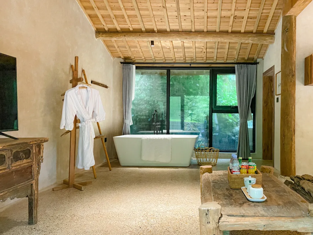 其他几个房型每一幢都不太一样,面积基本都在40到50平米之间(最小的客房21平米),套餐里的「山野竹音」房会相对小一点,想要面积更大视野更高,可以选择现场付费升级。