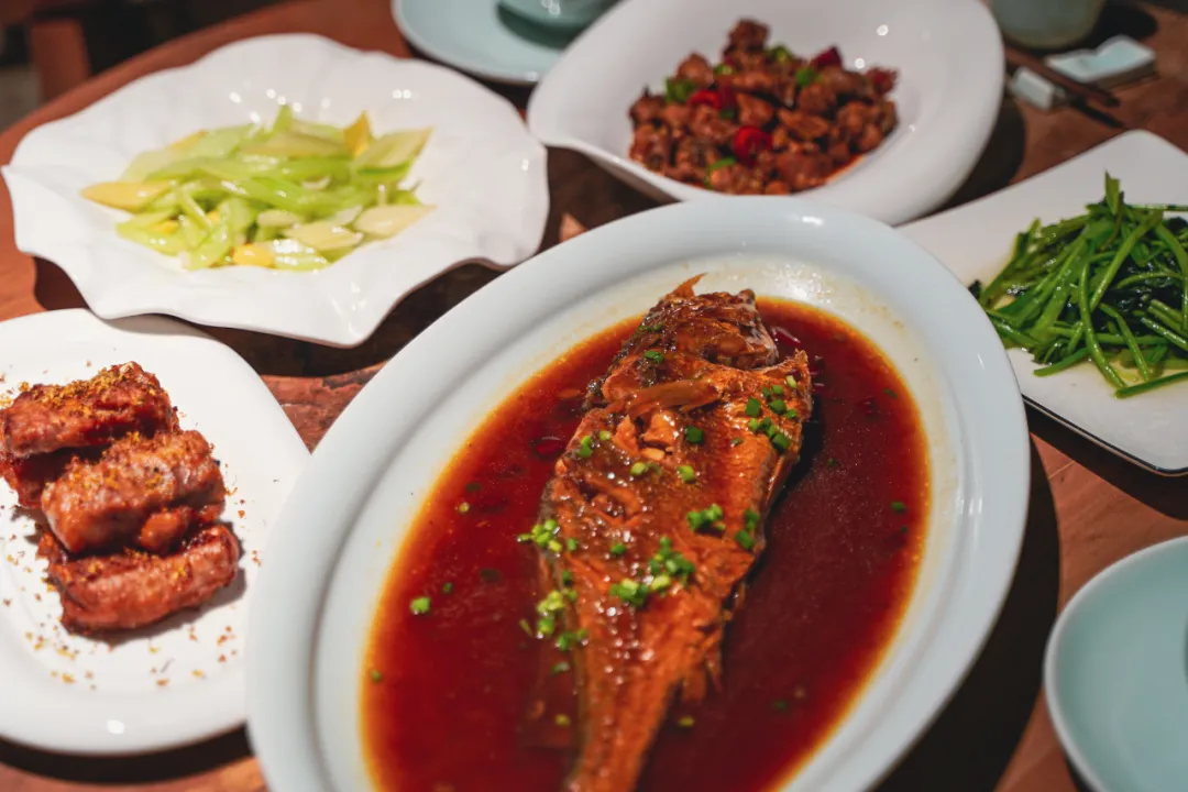 我也在这里吃了一顿晚餐,属于中式家常菜系,家烧黄鱼、竹林生炒鸡、炒时蔬……菜品都没有踩雷,推荐酱香排骨,咸香脆口,很好吃。不过记得要用餐的话,一定要提前向管家预定。