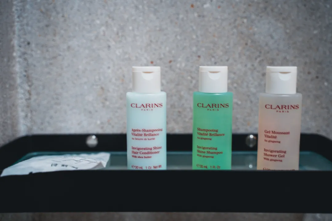 卫生间用了质朴的原色,简练整洁,用以前的老旧的木门做了隔断,非常有特色。硬件方面,除了智能马桶,墙上挂的是戴森的吹风机,这至少能跟很多高端酒店看齐,备品用的是Clarins娇韵诗的。