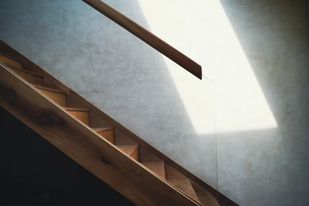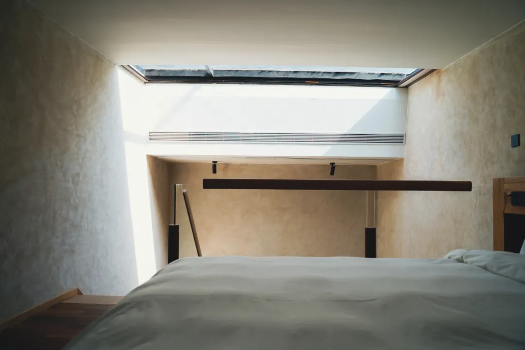 屋顶留了一片透明的玻璃天窗,将自然光线引入屋内。从楼梯上去,二楼卧室区域同样用了落地玻璃窗,躺在床上就能看到大面积的绿色,风景不错,床头是JBL的音响,整体硬件都很OK。