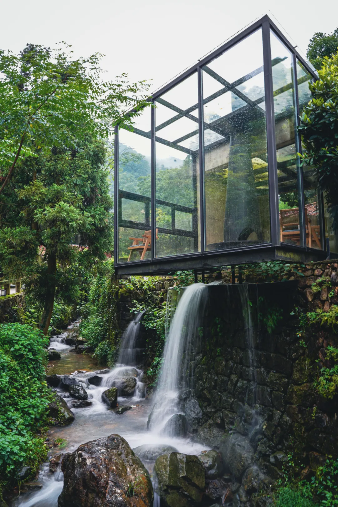 我最喜欢的是餐厅隔壁的空间,突出一截玻璃房悬在溪水上,最特别的地方是他们在建筑下方「造」了一方瀑布,踩在玻璃地砖上,还能感受到水流的震动,很有趣。角落特意放了一张椅子,是拍照的绝佳机位,只能说酒店真的非常懂了。