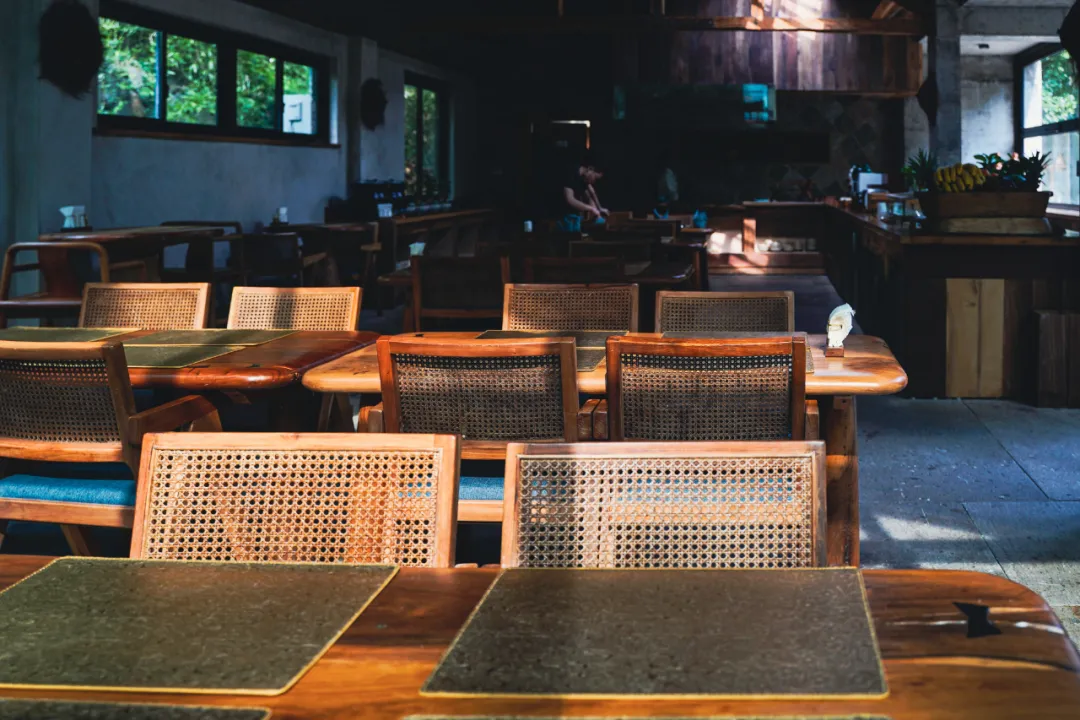 酒店一共有中、西两间餐厅和一间咖啡厅,咖啡厅目前还没正式开放。早餐和下午茶都在中餐厅,建筑顶部同样是木制结构,光影打下来还蛮好看的。