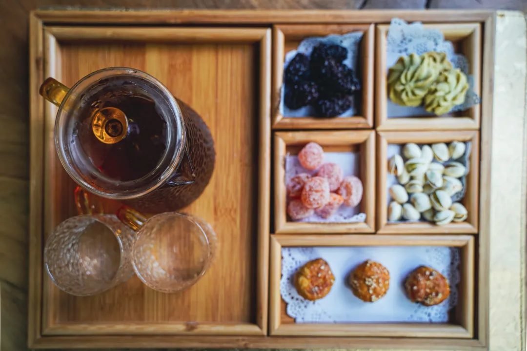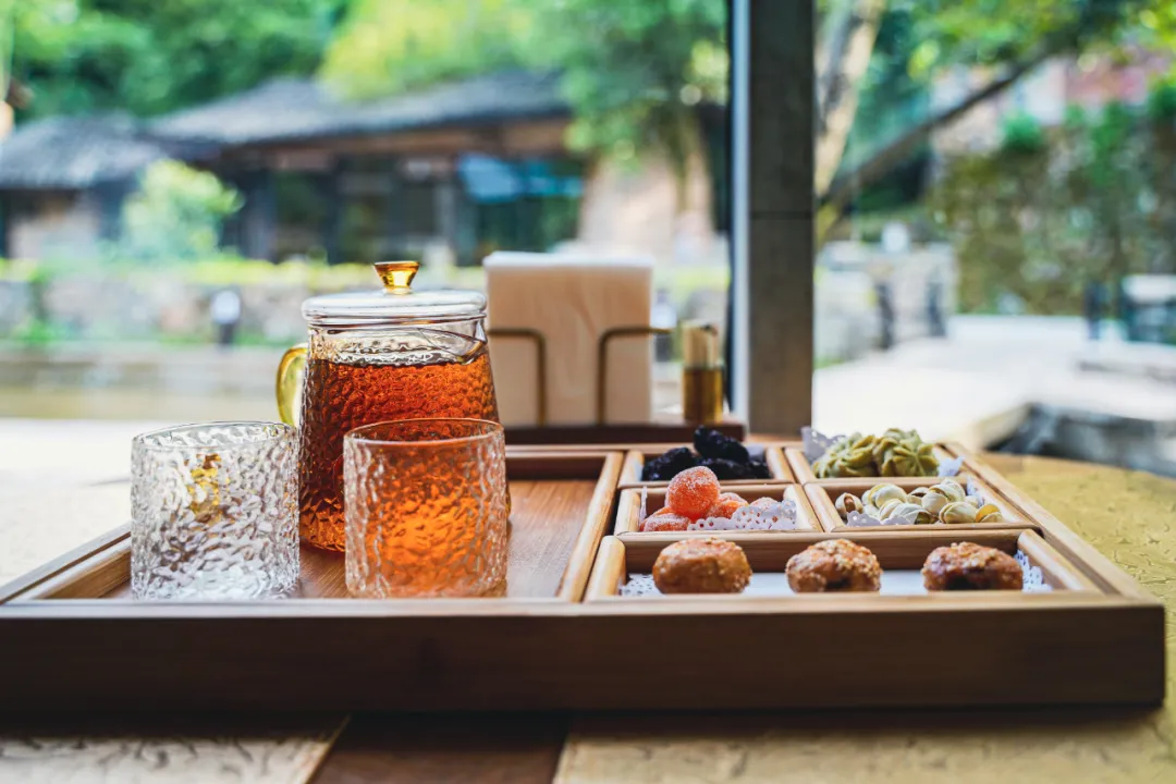 套餐里含一份下午茶,本来以为是常见的甜点咖啡,没想到上来的是中式的蜜饯干果和茶饮,匹配酒店氛围,还挺喜欢的。