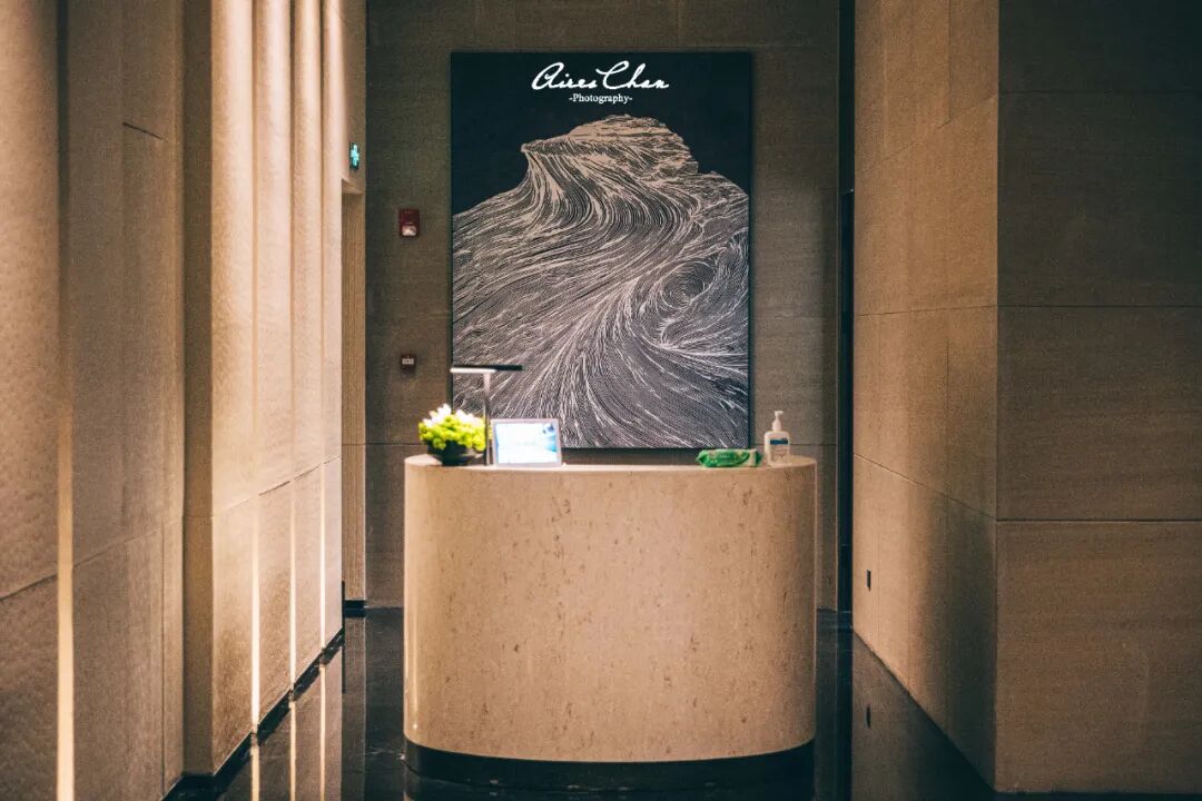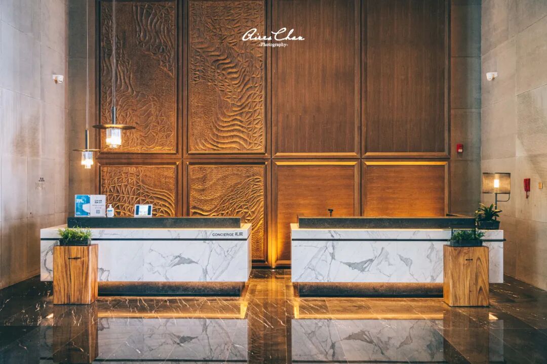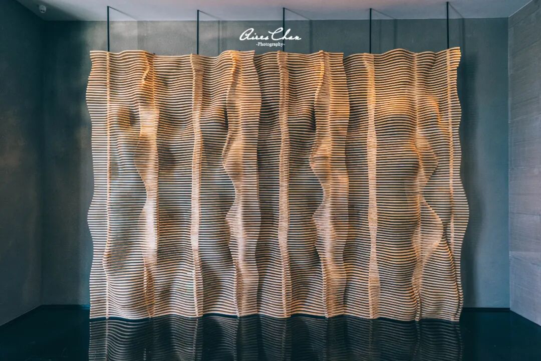前台与礼宾台后方上下贯通的背景木雕,选用白蜡木凹凸雕刻,将海浪潮汐的纹理与渔网的形态巧妙融合,跃然于上,使整个空间倍显灵动。