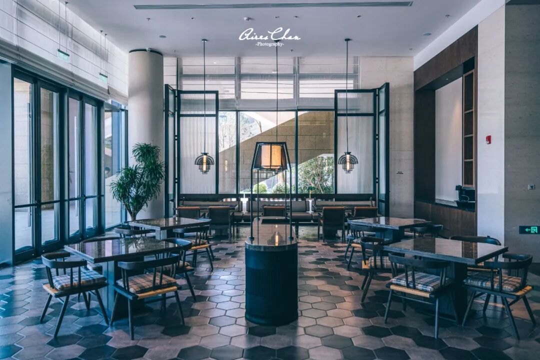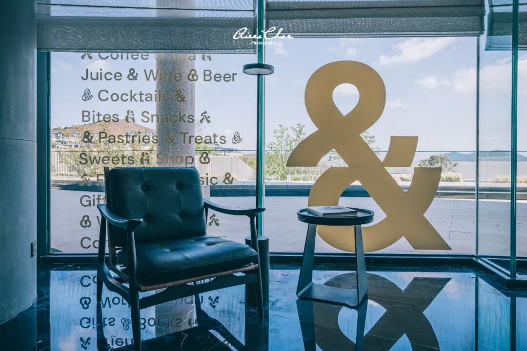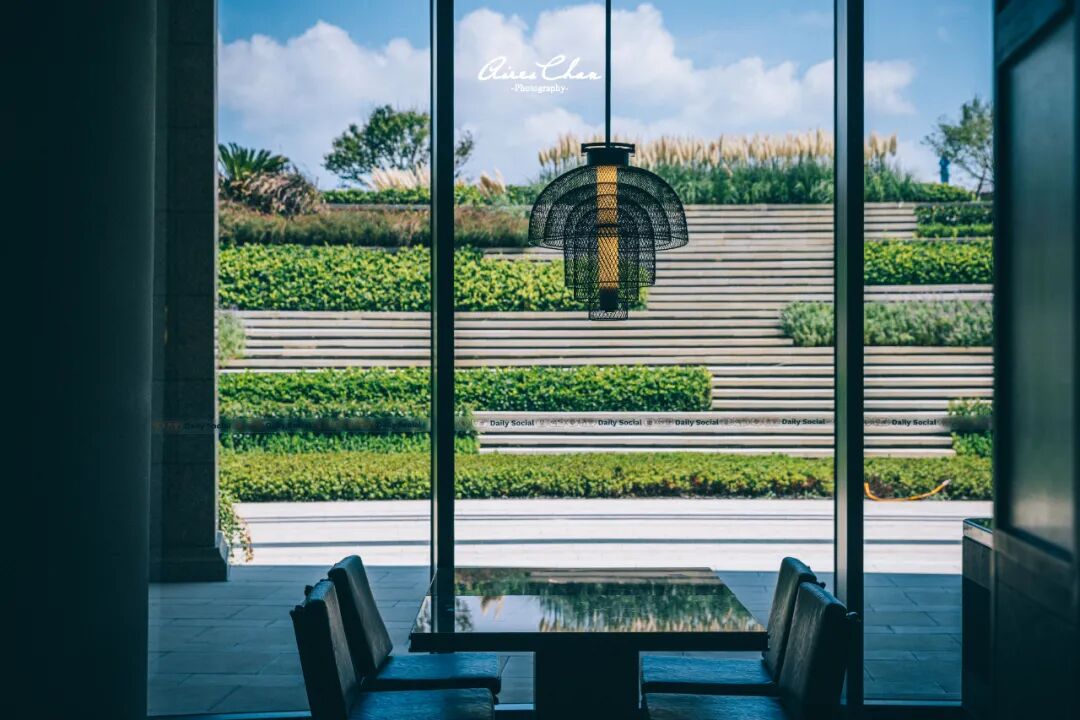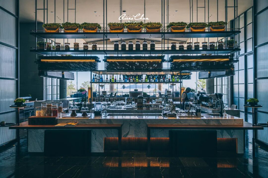 咖啡吧与户外露台相连,这里最大的特色在于落地窗前的假山其实和远处的大羊屿(因形似笔架又名「笔架山」)相对应,大家自行去现场看看吧~