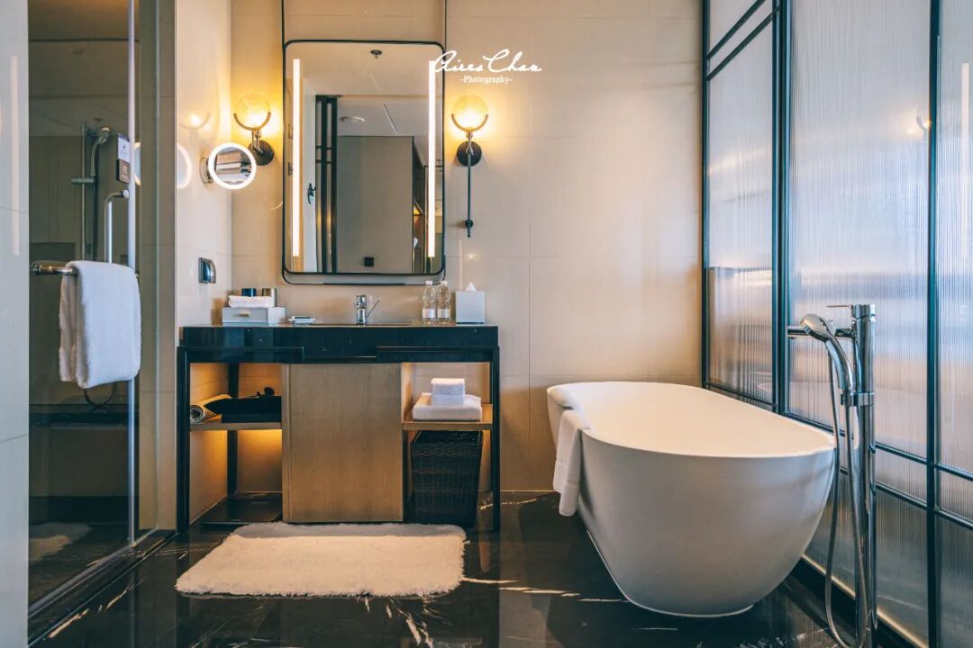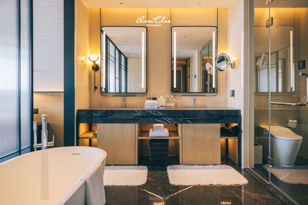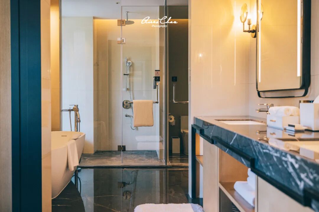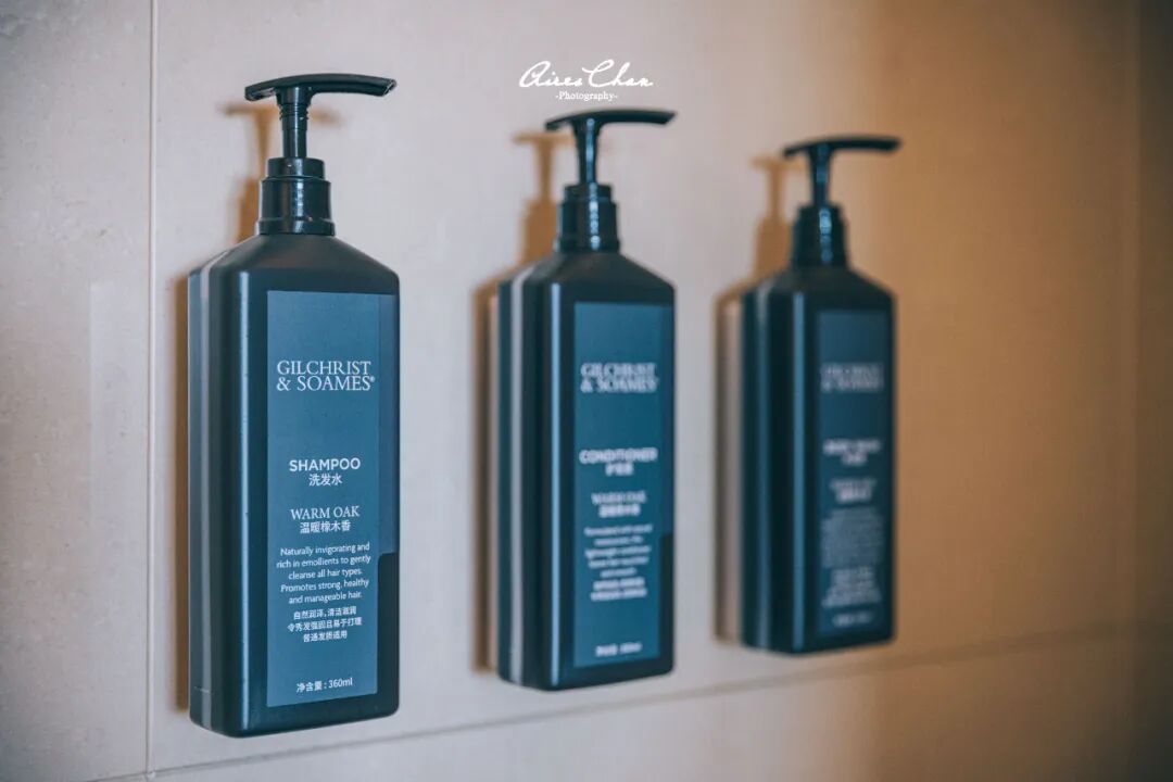 浴缸是客房的标配,独立洗手间设计增强了私密性,备品也换成了Gilchrist & Soames的大瓶装。海景房和山景房的布局大致都是这样,区别主要在于阳台外的景观。