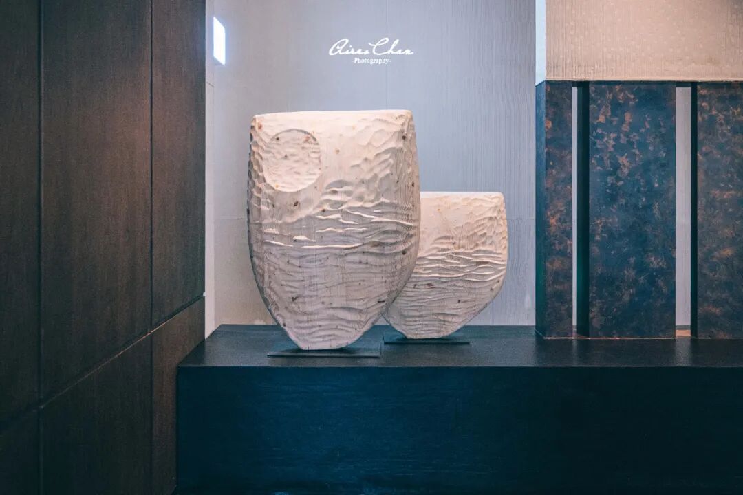 餐厅门口处有一个艺术装置,通过陶瓷以及雕刻工艺结合碎沙石打造出了「海上生明月」的艺术氛围。