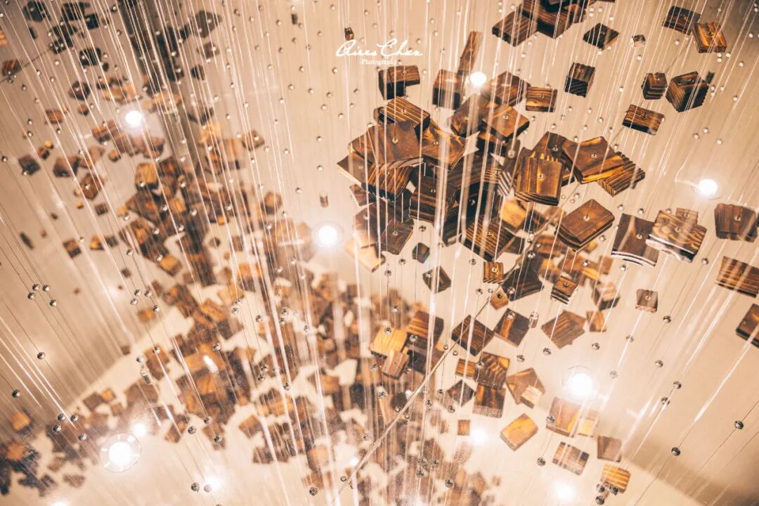 在餐厅门口的拐角处,还有一处名为「鱼跃」的艺术装饰,取了「愉悦」的谐音。它以船木木块吊拼而成鲸鱼意象,底部的镜面效果象征海面,从视觉上使有限空间无限延展。「鲸鱼」跃出海面带起丝丝缕缕的浪花,也是海港意象的神来之笔。