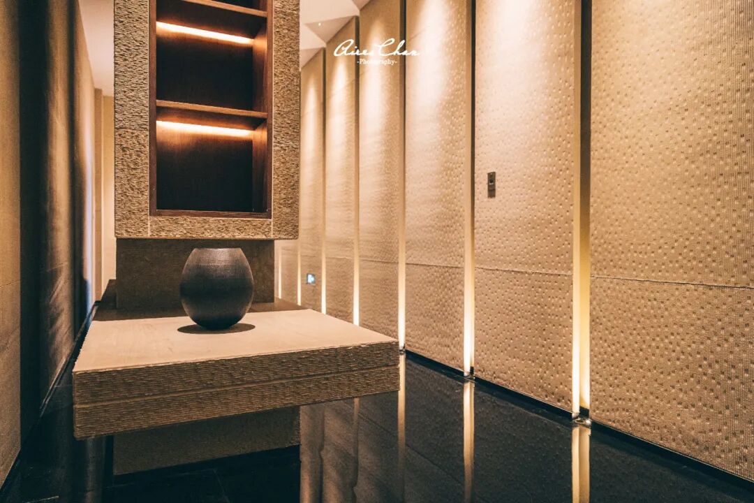 端景台上有一块大石头,80,000多颗黑米意为八方聚财的海水,「海面」之上则是酒店建立之初的「开山第一石」,它被打磨成了岛屿的形状,即是「东方不老岛,海山仙子国」的缩影,也是大堂融贯山海风韵的点睛之笔。