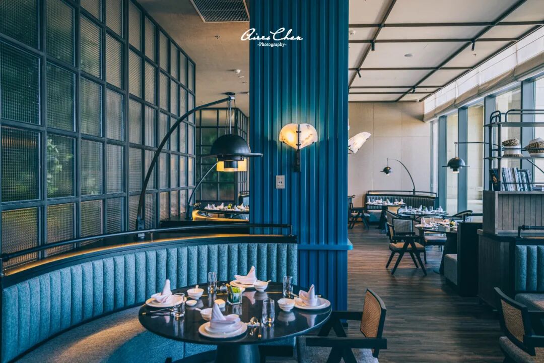 船型接待台搭配金属渔灯,营造出浓郁的渔港风情;餐厅内的区域划分使用了当地渔村特色网格玻璃屏风,搭配海洋蓝木质墙壁,宛如置身渔村人家,创造出海岛渔港的特色用餐体验。