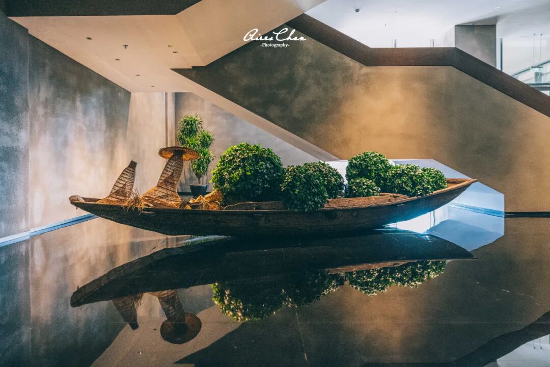 一是楼梯口的「木雕石林」,通过拼接木板重现石林的场景,意在打造山海一景的空间氛围;另一个是楼梯底下的一叶小舟,它以真实船只打造绿植端景,仿佛泛舟海上,寓意满载希望,惬意而行。