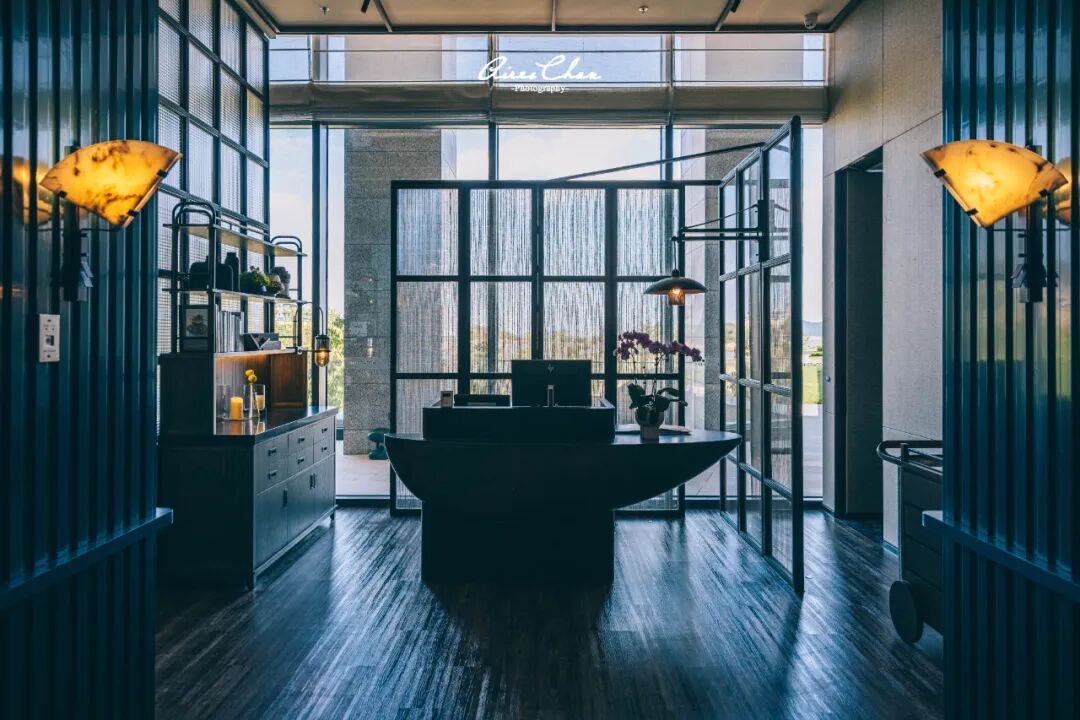 穿过正门进入2楼大堂,设置于前台与咖啡吧之间的竖纹玻璃屏风排列有序,营造出层次分明的石林艺术空间,并与落地窗外的海面相映成趣。