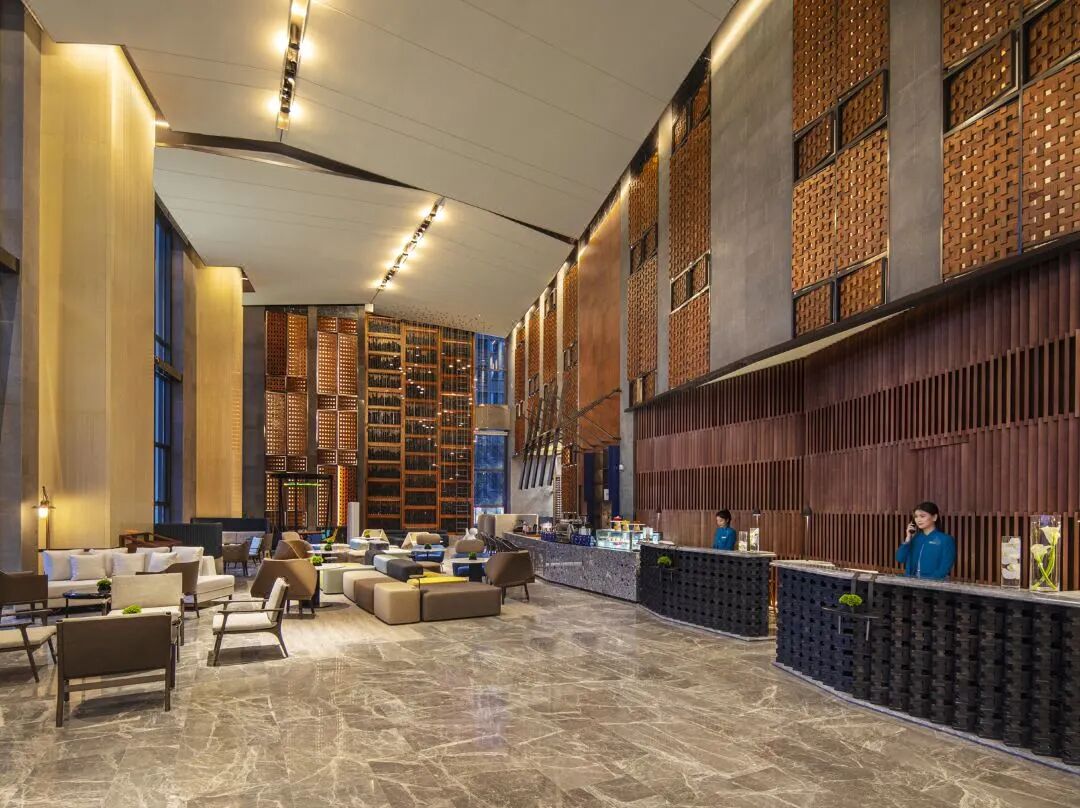 酒店以福建茶文化、三坊七巷等为设计灵感,进门就能看到福建市花茉莉花,大堂同时萃炼青砖黛瓦、轩窗、马鞍墙、榫卯结构、坡屋顶天花等元素,体现了「院士之乡」三坊七巷的文化精髓。