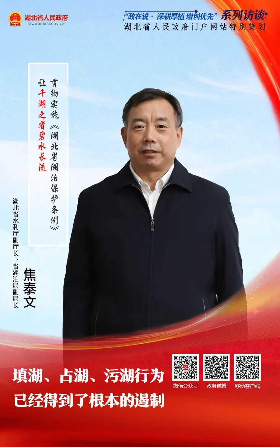 湖北是千湖之省,历来重视对湖泊的保护。2012年,省人大常委会专门颁布地方性法规——《湖北省湖泊保护条例》,这部条例施行至今已有十年了。十年来,湖北的湖泊保护取得了哪些成效、湖泊现状如何?10月12日,湖北省水利厅副厅长、省湖泊局副局长焦泰文,将做客湖北省人民政府门户网站“迎接党的二十大·政在说”系列访谈,和大家聊聊全省湖泊保护工作的进展情况。