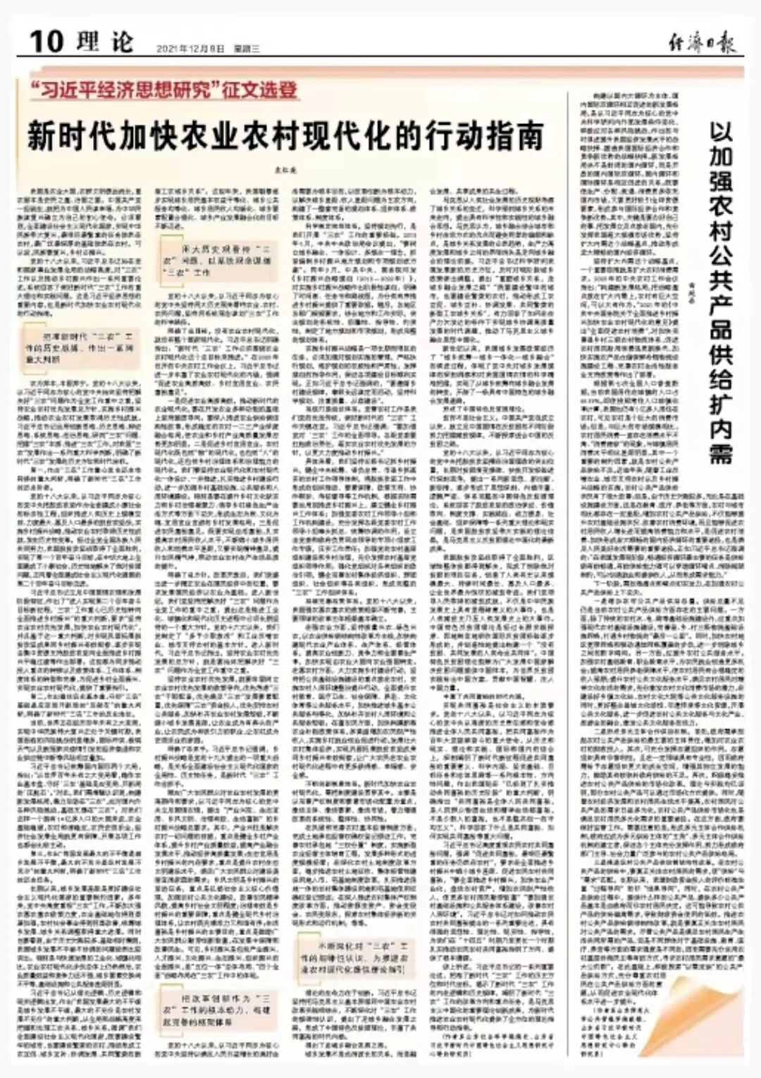 经济日报论苑今日继续推出“习近平经济思想研究”征文选登专栏,刊发山东社会科学院院长袁红英的文章《新时代加快农业农村现代化的行动指南》,以飨读者。