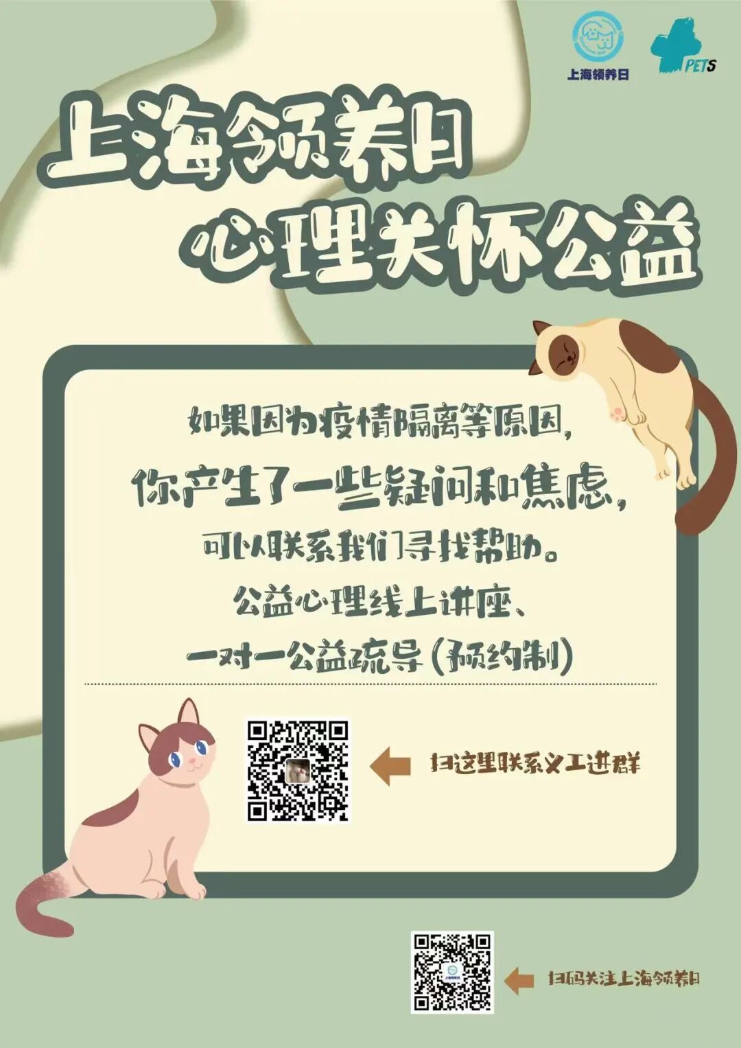 上海依然在疫情中,我们继续附上上海领养日的互助公益海报,也希望各位家长和自己的毛孩子都安全度过这段时光!如果你身边的养宠伙伴遇到同样的困难,需要帮助,请马上联系我们的志愿者!我们一起渡过这段难过的时光!