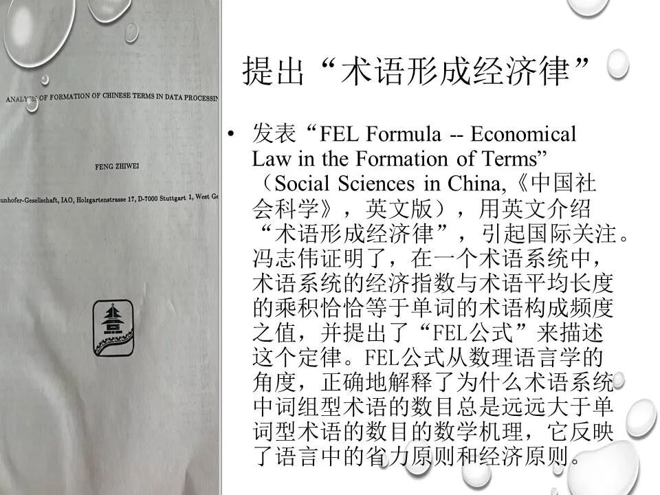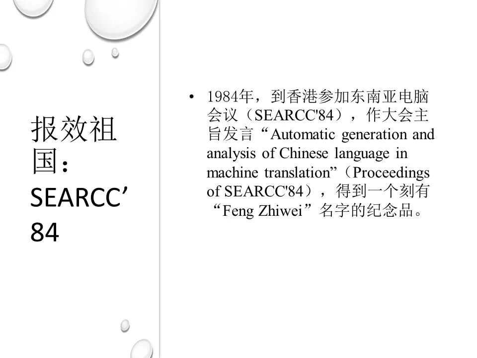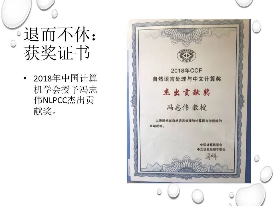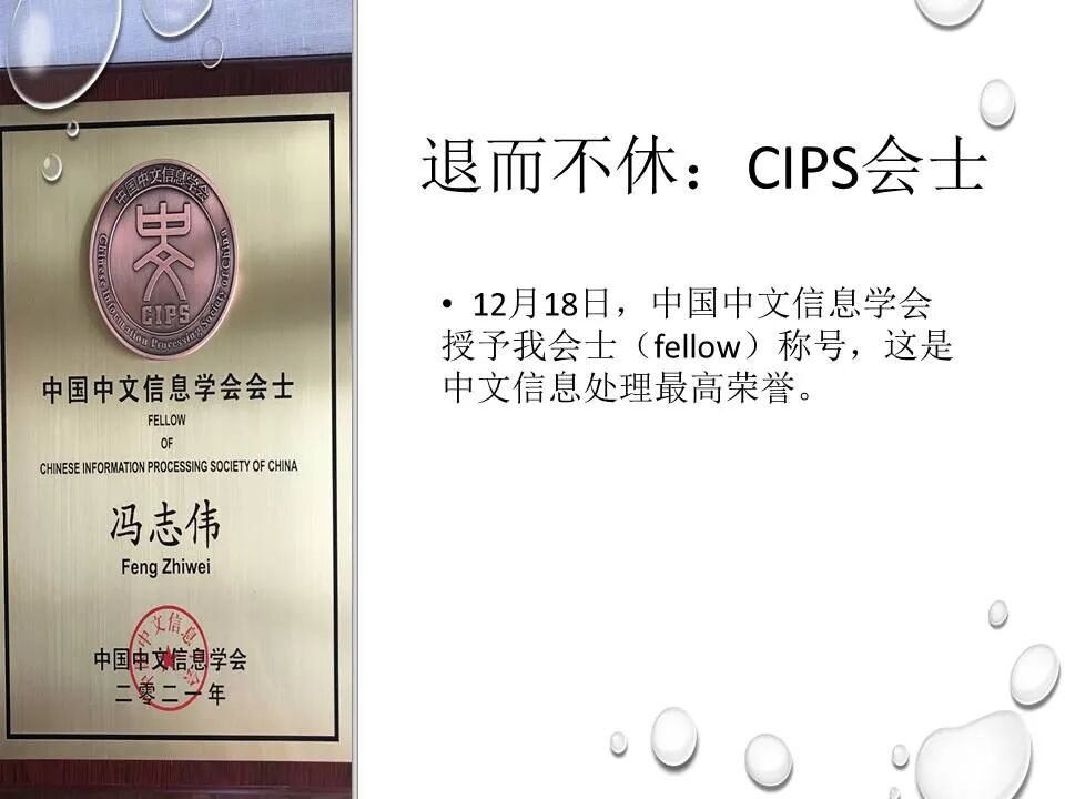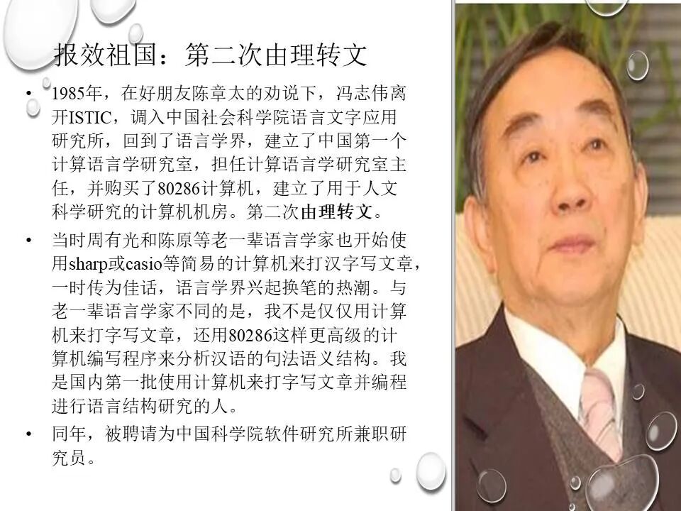 冯志伟,1939年生,计算语言学家,昆明一中中学毕业,北京大学和中国科技大学研究生院两次研究生毕业,文革期间首次测出汉字熵为9.65比特,为汉字多八位编码提供了语言学支持。法国留学时师从国际计算语言学学会第一任主席Vauquois,研制了世界上第一个把汉语译为多种外语的机器翻译系统,是第一个出席国际计算语言学顶会COLING的中国学者。长期从事语言学和计算机科学的跨学科研究,曾在德国、韩国的大学担任教授,讲授自然语言处理课程,出版论著30多部,发表论文400多篇,主持研制国际标准1项、国家标准1项、国家规范3项,参与研制国家标准13项。担任国内外著名杂志编委,曾任中国语文现代化学会副会长,中国人工智能学会理事,《中文信息学报》顾问。工作单位:教育部语言文字应用研究所。2006年获奥地利维斯特奖,2018年获中国计算机学会NLPCC 杰出贡献奖,2021年获中国中文信息学会会士称号,2022年获香港圣弗朗西斯科技人文奖。