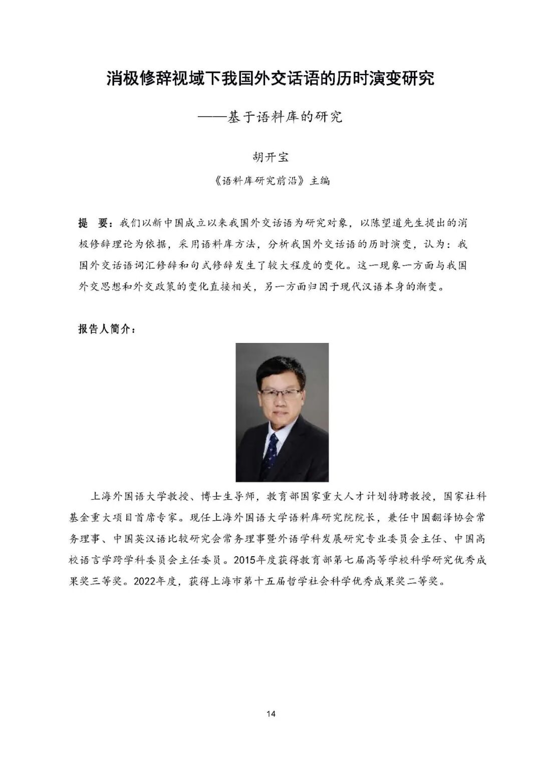 专家论坛 (2) | 14:00-14:30 | 胡开宝:语料库批评翻译学视域下的译者行为研究:理据与路径为例 | 陈勇 |